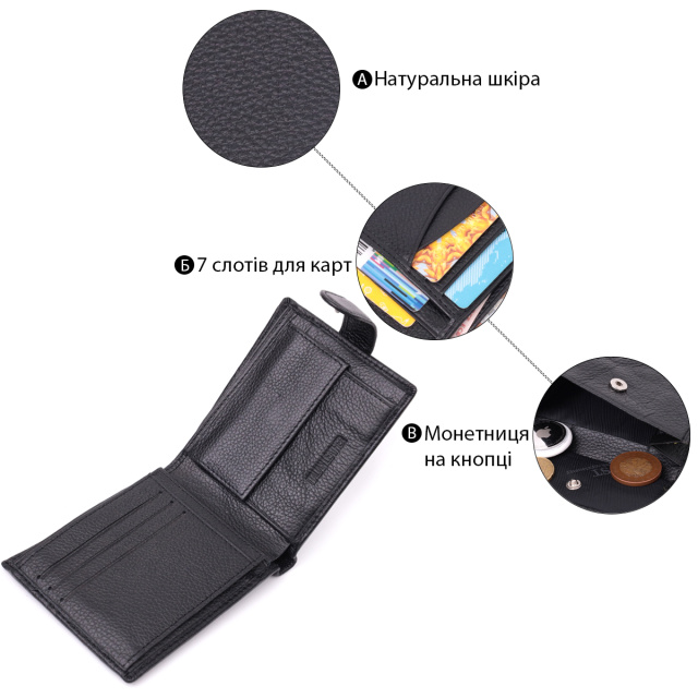 - 1 карман для монет, что закрывается клапаном на магнит;