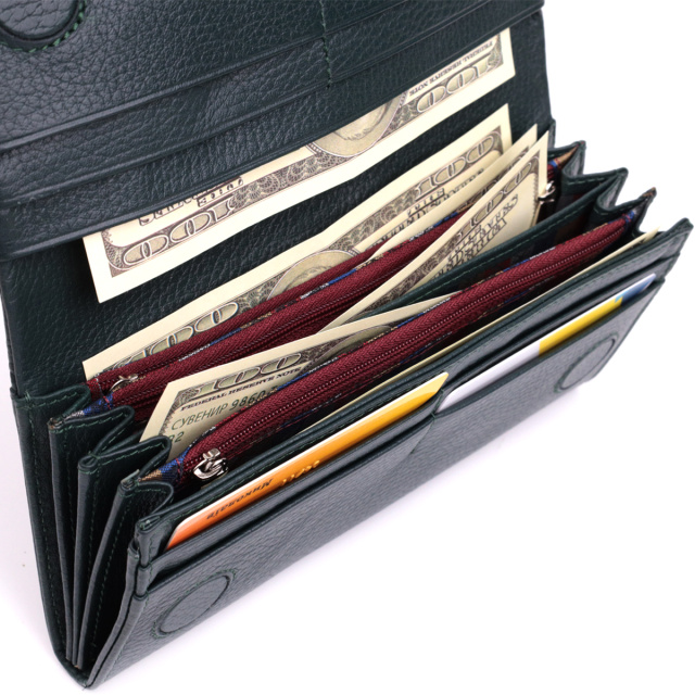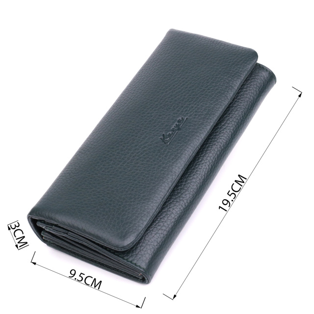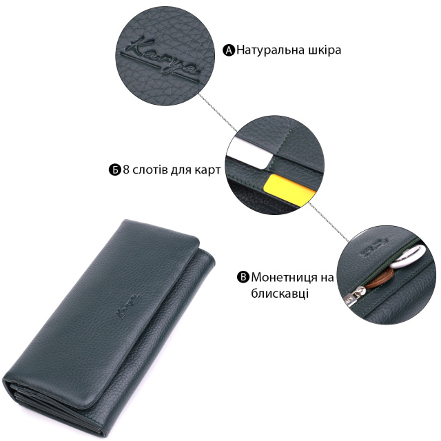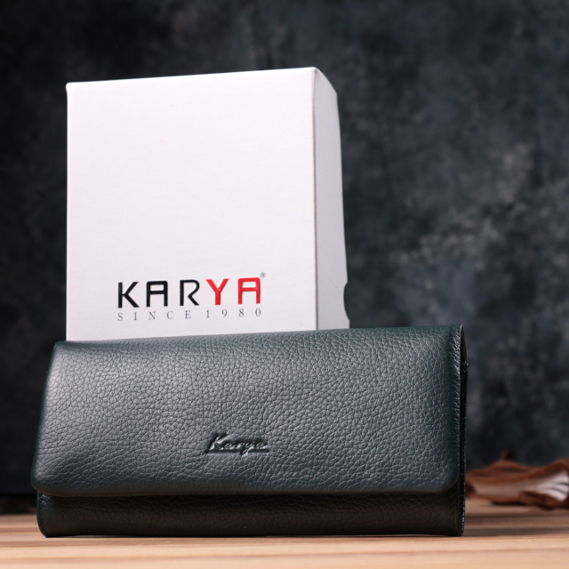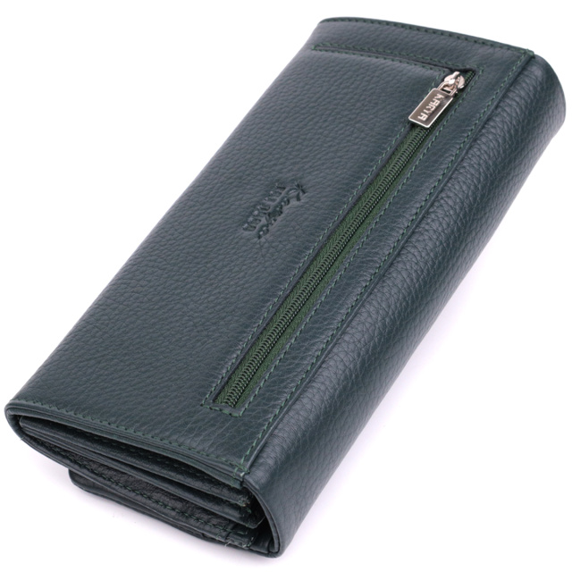 Практичный женский кошелек из натуральной кожи. Модель создана в красивом зеленом цвете. Кошелек удобно лежит в руке. Дизайн кошелька продуман для удобства любой девушки. В кошелек Вы сможете разместить все ваши деньги, карточки и визитки. На лицевой стороне аксессуара тиснение логотипа бренда. В комплекте к кошельку идет фирменная картонная упаковка. Кошелек от турецкого бренда станет прекрасным подарком для любой девушки.