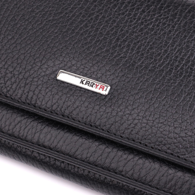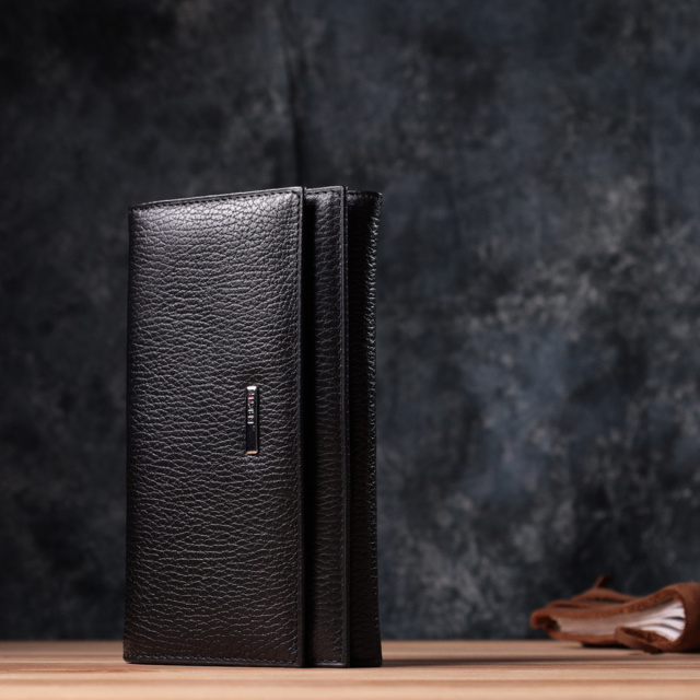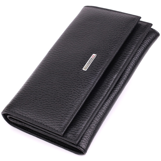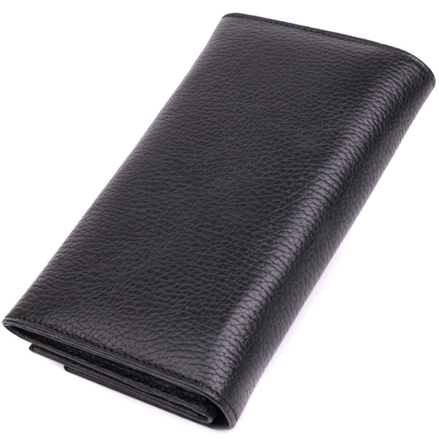 Отменный женский кошелек из натуральной зернистой кожи, в классическом черном цвете. Изделие состоит из двух автономных отделений, которые закрываются клапанами на кнопку. Внутри представлено множество карманов, в которых можно удобно разложить купюры, пластиковые карточки и документы. Такой кошелек из натуральной кожи - это идеальный вариант на каждый день для тех, кто ценит качество, удобство и комфорт, а также будет отлично дополнять Ваш повседневный образ.