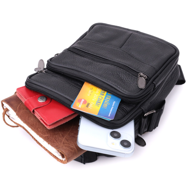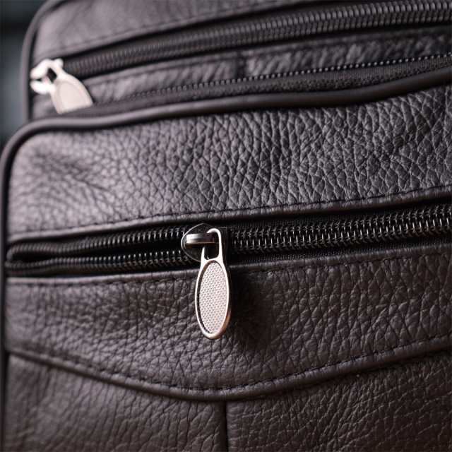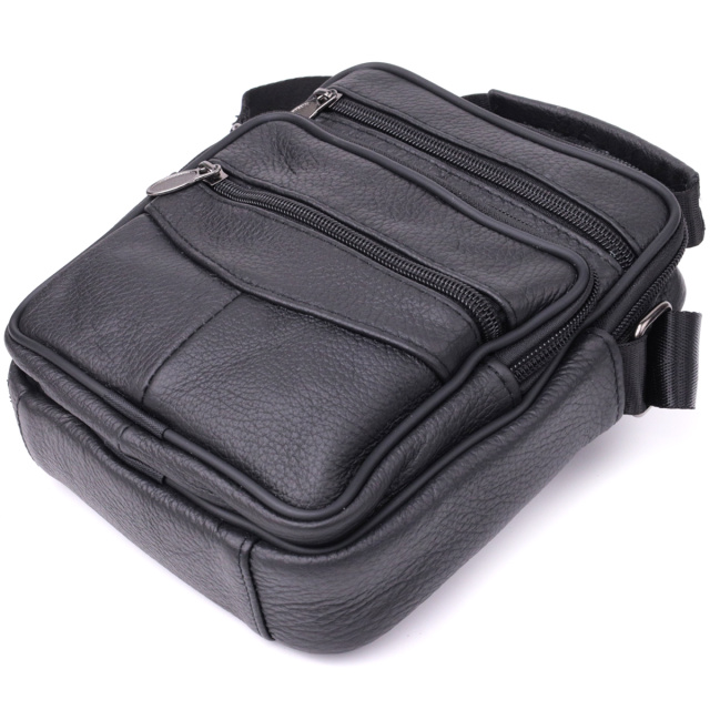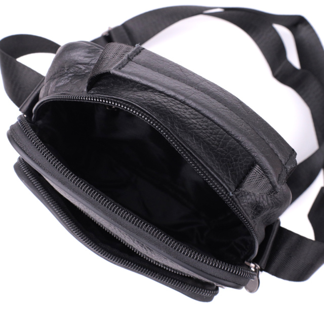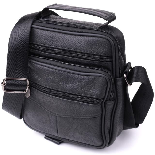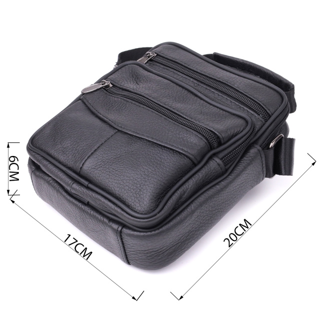 Практичная небольшая мужская сумка через плечо из качественной кожи с повышенными показателями прочности и устойчивости к износу. Аксессуар удобно носить на плече и через плечо, для этого есть текстильный регулируемый ремень, а также в руке, для этого предусмотрена кожаная ручка. В дизайне данной модели нет ничего лишнего, а это особо важно для ценителей лаконичности. Все карманы закрываются на молнии, подкладка из прочного текстиля.