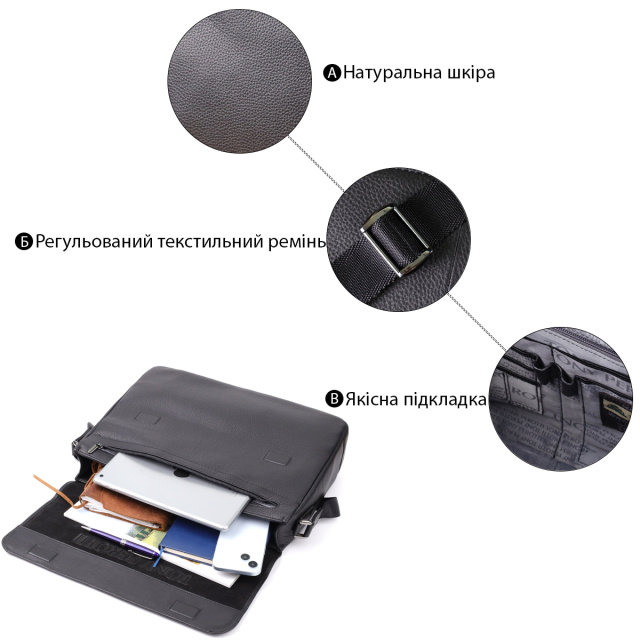 – выполнен из натуральной зернистой кожи черного цвета;