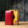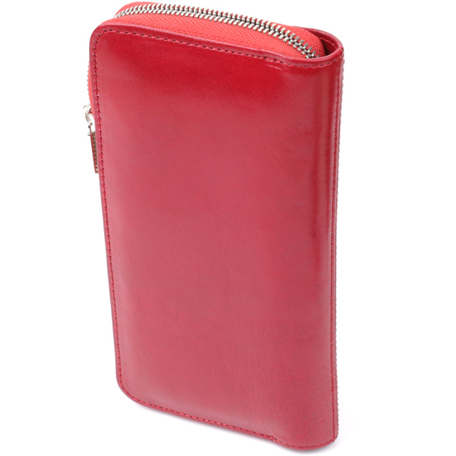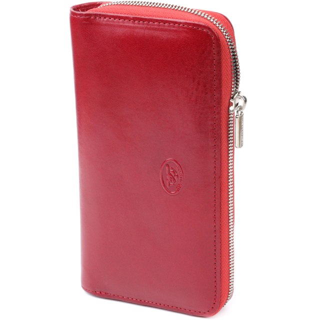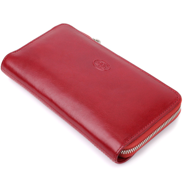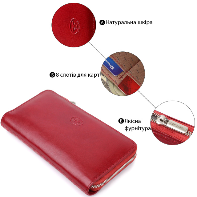 – выполнен из натуральной кожи красного цвета;