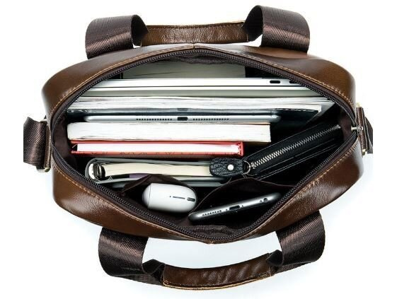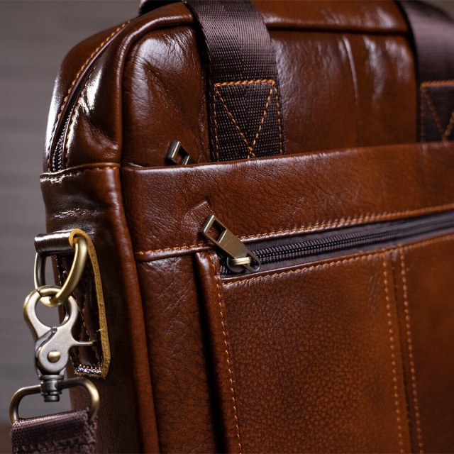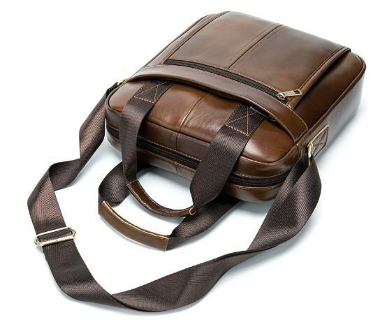 Солидная мужская сумка из натуральной кожи в коричневом цвете. Аксессуар можно носить как в руках с помощью ручек так и на плече есть съемный текстильный ремешок. Модель дополнена металлической фурнитурой. По краям аксессуар прошит рыжей нитью. Вы должны понимать, что немного переплатив за кожану сумку вы выиграете в том, что она прослужит вам намного дольше чем текстильные или из заменителя. Аксессуар удобно держать в руке. Сумка не тяжелая и имеет огромный функционал. В ней вам будет удобно носить документы или планшет или книгу. С такой сумкой будет удобно ездить на встречи или в командировки. Она подчеркнет ваш статус и чувство стиля. Сумка будет желанным подарком для любого мужчины. Аксессуар упакован в тканевой мешок, что защищает его от пыли и влаги во время того как вы его не используете.