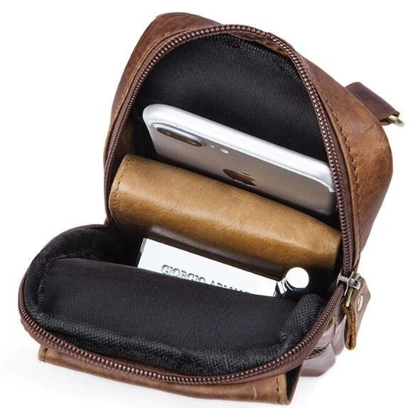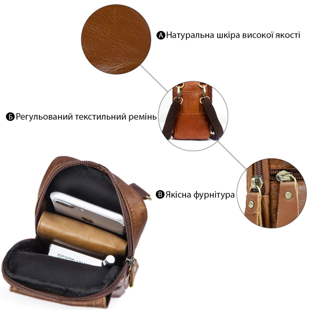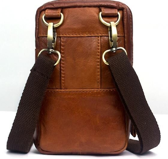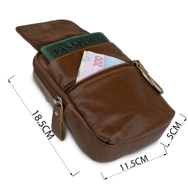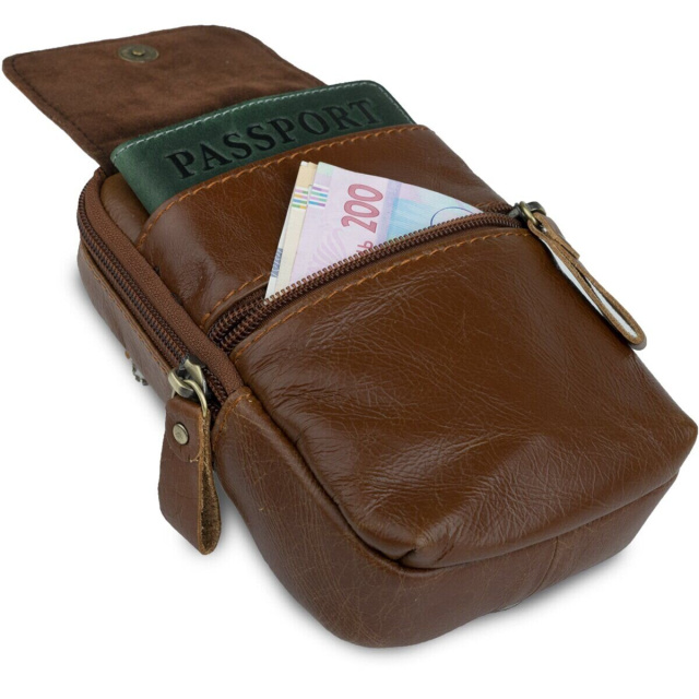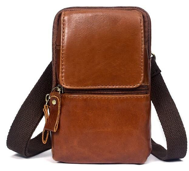 Стильная и одновременно компактная мужская сумка из натуральной кожи через плечо. В комплект идет тонкий текстильный ремешок черного цвета. По краям аксессуар прошит темной нитью. Все швы ровные, торчащих ниток нет. Внутри аксессуара плотная текстильная подкладка коричневого цвета. Сумка будет вашим идеальным вариантом на каждый день для мобильного телефона, денег и документов. Модель очень удобная. Классический дизайн никогда не выйдет из моды. Такая сумка подойдет под любые вещи из вашего гардероба. Дополнена красивой золотистой застежкой на лицевой стороне.