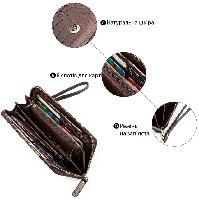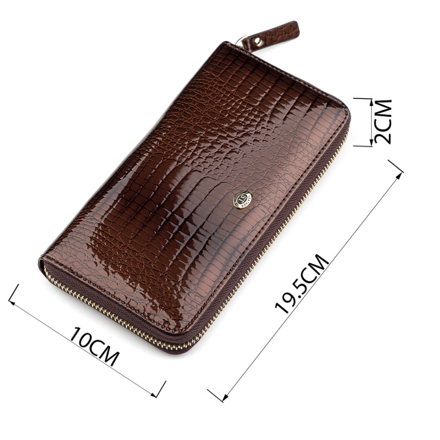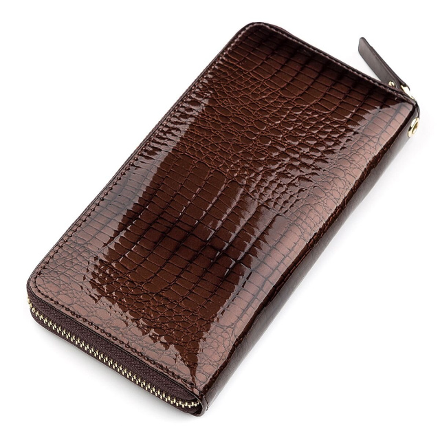 Представленный женский кошелек имеет средние размеры, изготавливается исключительно из натуральной кожи, благодаря чему комфортно располагается в руках. Аксессуар имеет закрывающийся механизм в виде молнии, а внутри есть много отделений и секций для удобного расположения бумажных купюр, и платежных карт. Порадует поклонниц стиля интересный ремешок на запястье и декорированный рисунок под кожу крокодила. Внешний вид отличается привлекательностью и презентабельностью.