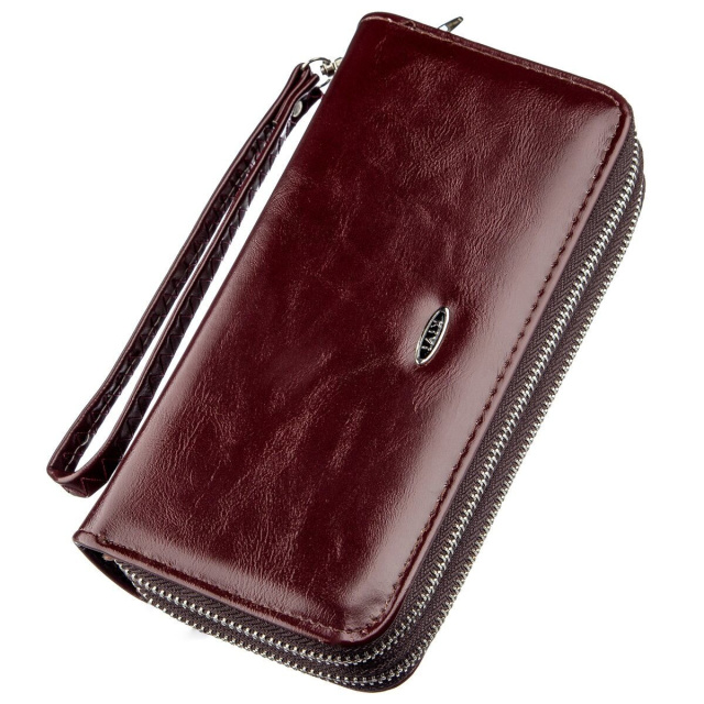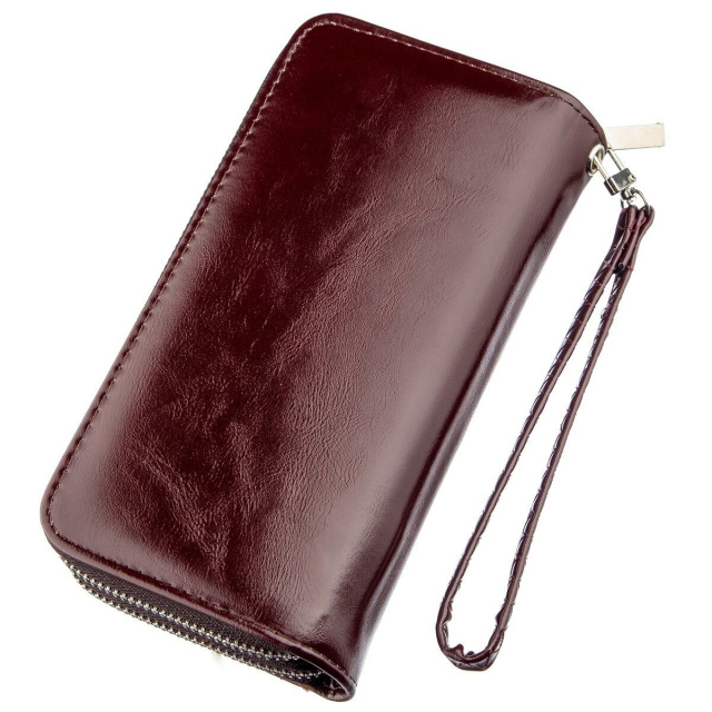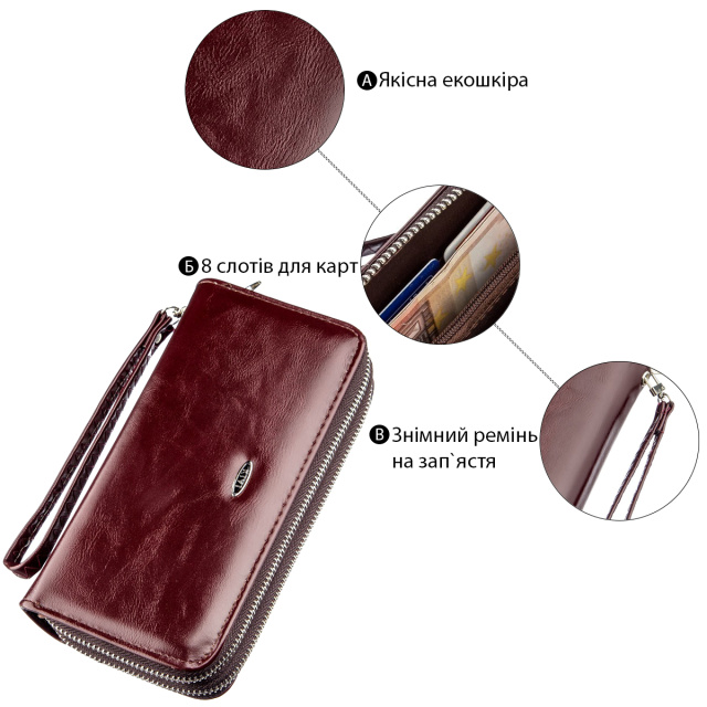Вместительный кошелек из экокожи. Модель имеет два автономных отделения для большого количества купюр, ячейки для карточек и съемную ручку на запястье. Такой кошелек вы можете носить как в сумочке, так и на руке с помощью ручки-петельки. Внутри кошелька подкладка в сочетании экокожи и текстиля. Изделие дополнено качественной фурнитурой серебристого цвета. Такой кошелек станет прекрасным подарком для любой девушки.
