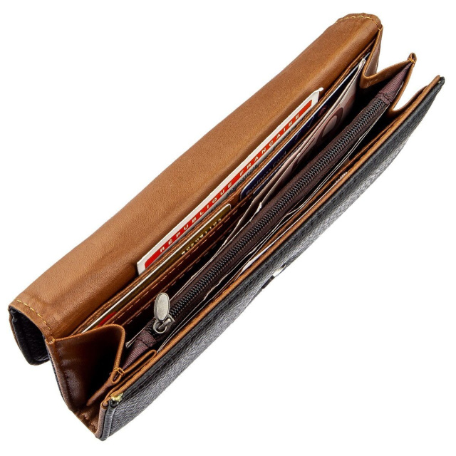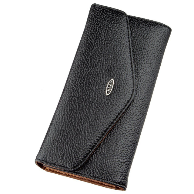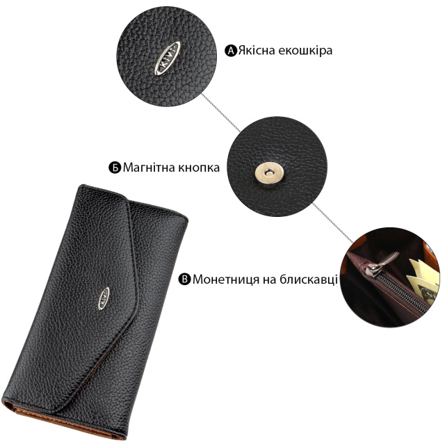 Кошелек выполнен из экокожи и внешне по своему дизайну напоминает конверт. Модель имеет два просторных отделения для купюр, отделение на молнии и удобные ячейки для кредиток. Внутри модели подкладка в сочетании экокожи коричневого цвета и прочного текстиля. Закрывается изделие на клапан с магнитной кнопкой. На лицевой стороне аксессуара вы можете увидеть металлический логотип бренда. Кошелек не прихотлив в уходе и станет прекрасным подарком для любой девушки.