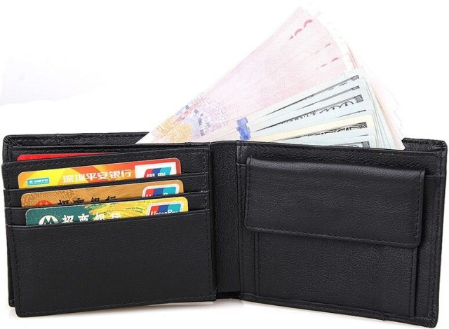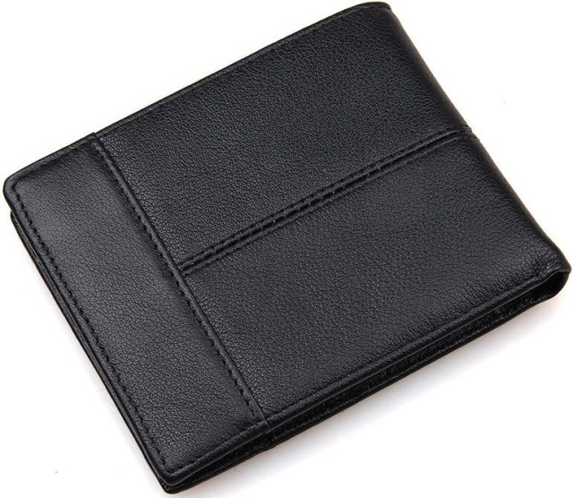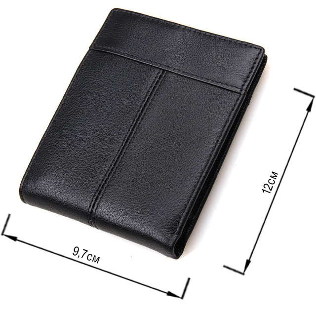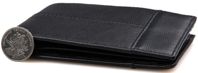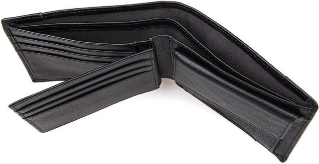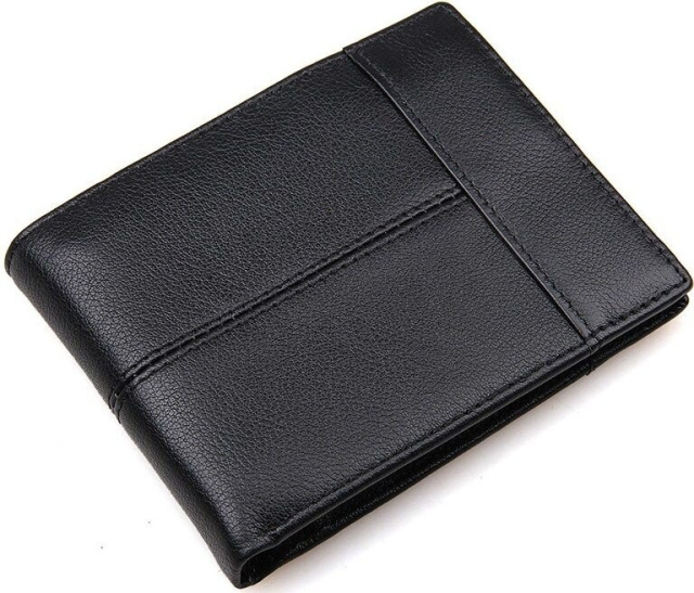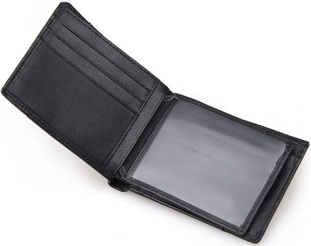 Современный мужской кожаный бумажник черного цвета. Аксессуар аккуратно прошит сверхпрочной нитью черного цвета, Внутри кошелек имеет два кармана для купюр. Которые помещаются в развернутом виде. Имеется отделения для карточек, монетница на заклепке и прозрачный карман для документов. Кошелек удобный при использовании, легко помещается в карман штанов, не занимает много места в сумке. Кошелек упакован в текстильный пылезащитный чехол.