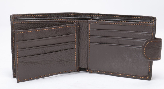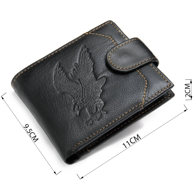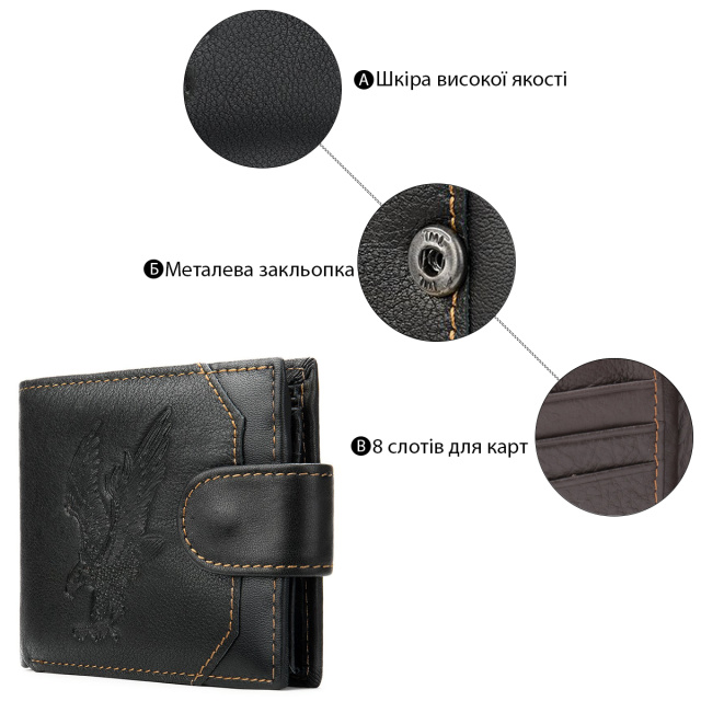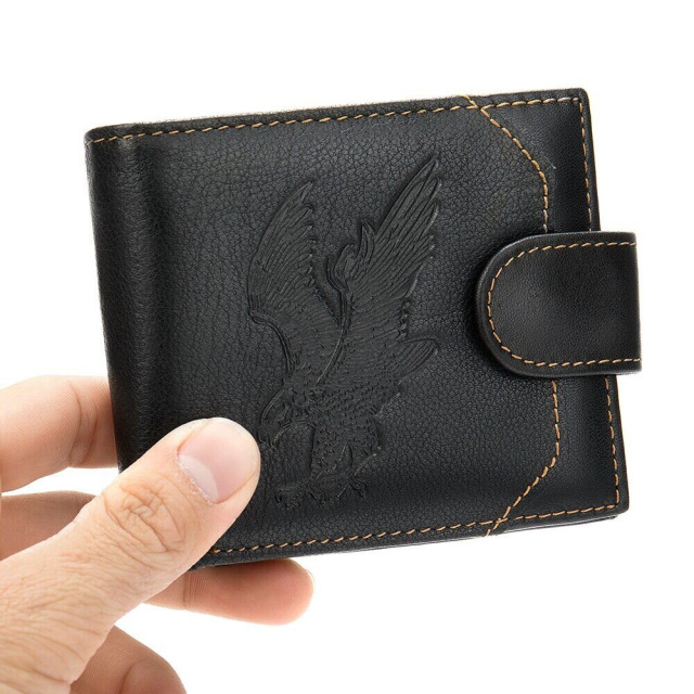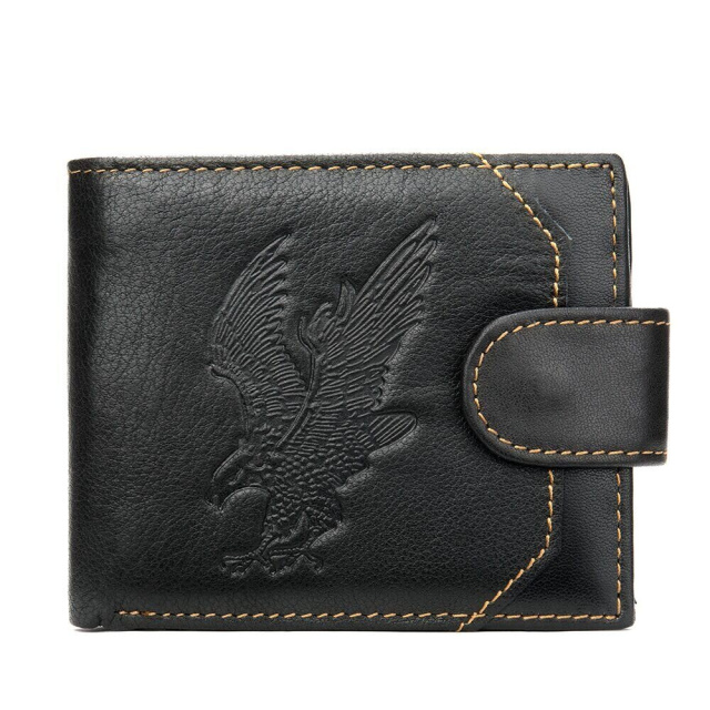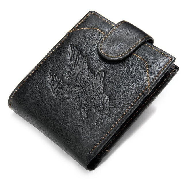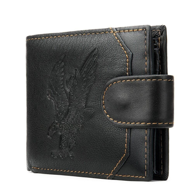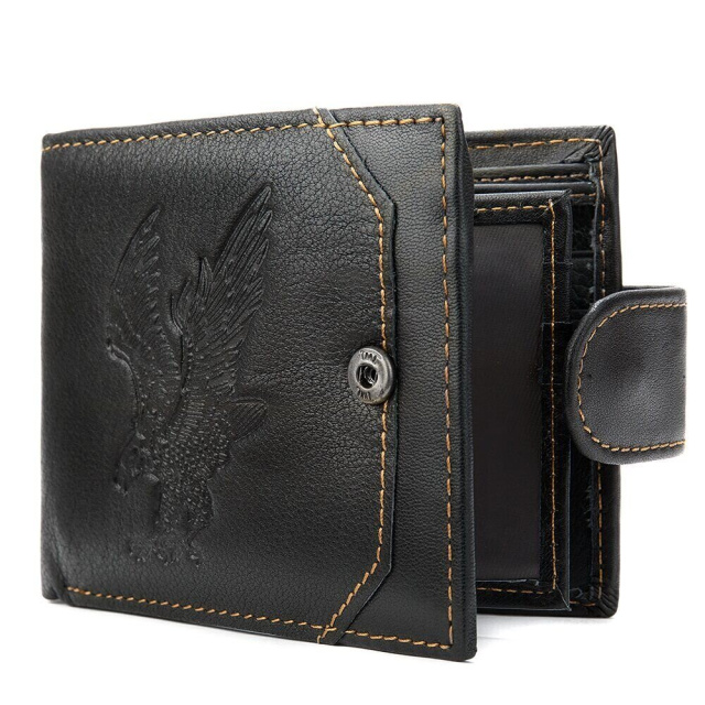 Стильное мужское портмоне из натуральной кожи, которое с легкостью поместится в карман брюк. По краям модель прошита светлой нитью и дополнена тисненным орлом. Закрывается портмоне на кожаный хлястик с кнопкой. Изделие имеет весь самый необходимый функционал. Портмоне очень вместительное. Аксессуар дополнен исключительно качественной фурнитурой. Мы уверены, что портмоне прослужит вам далеко не один год и станет прекрасным подарком для любого мужчины.