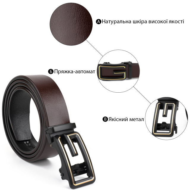 Стильный и солидный мужской ремень коричневого цвета из натуральной кожи. Модель изготовлена из цельного полотна. Дизайн продуман до каждой детали. Полотно ремня и пряжка красиво переливаются на солнце придавая вашему образу завершенности и элегантности. Пряжка ремня выполнена из крепкого металла черного цвета с эскизом буквы G золотистого цвета. Ремень незаменимая вещь в гардеробе любого мужчины. Особенно если ремень из качественного материала он будет служить вам значительно дольше. Стоит отметить, что качество ремня ничем не уступает дорогим брендам, но ценник - на порядок ниже. Рекомендуем вам данную модель как для себя, так и для своих близких.