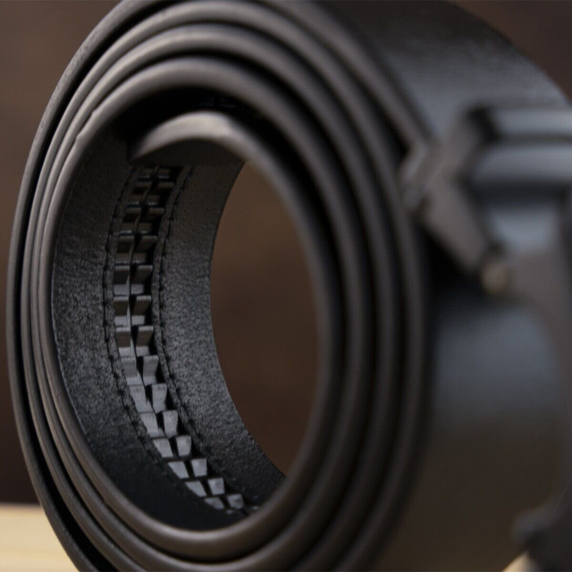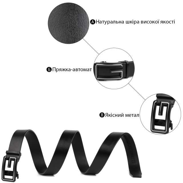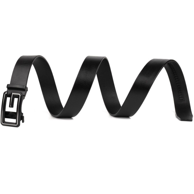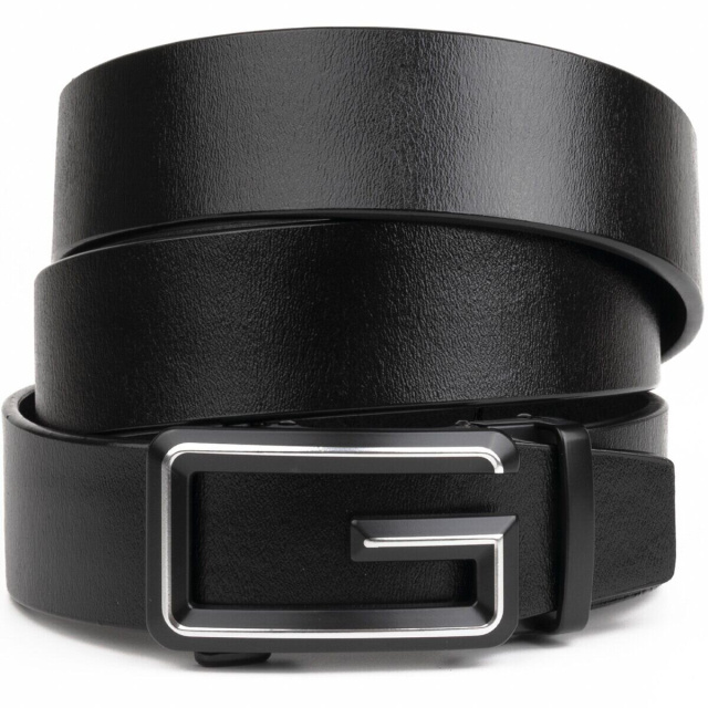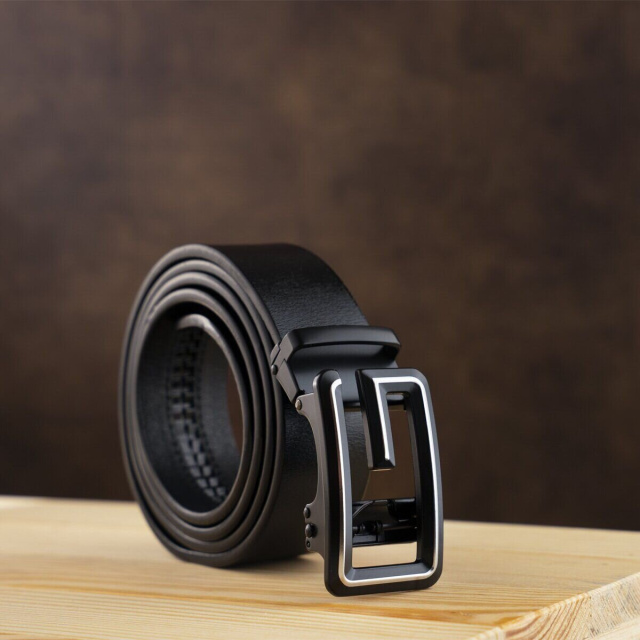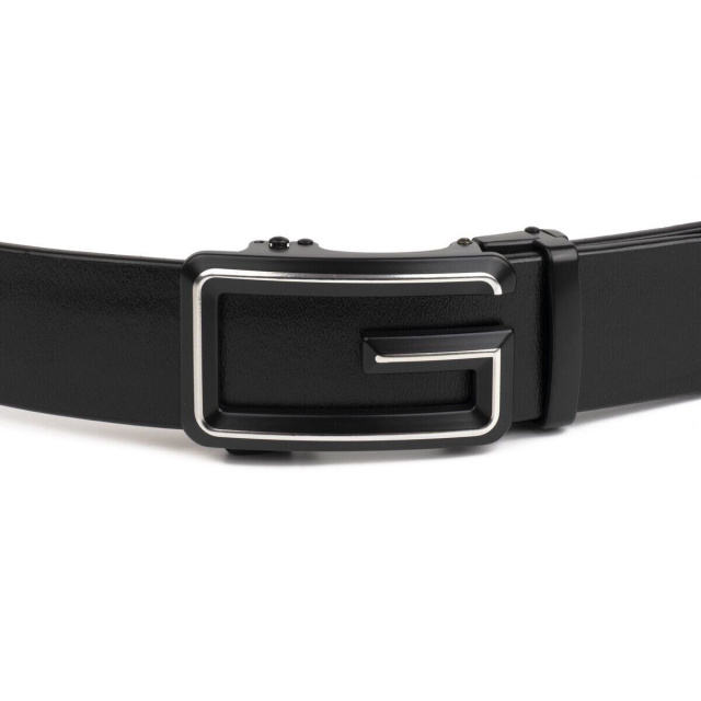 Качественный кожаный ремень черного цвета из натуральной кожи. Изделие прекрасно подойдет под любой ваш образ. Пряжка ремешка напоминает букву G в сочетании с затемненным металлом. Автоматическая пряжка очень проста в эксплуатации. Ремень не привязывает вас к определенной обуви. По качеству аксессуар ничем не уступает дорогим брендам, но при этом стоит значительно дешевле. Уверены, что ремень покорит любого мужчину. Рекомендуем вам данную модель, если вы находитесь в поиске качественного повседневного ремня.