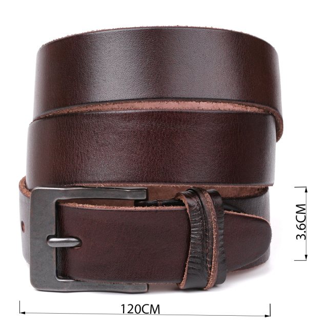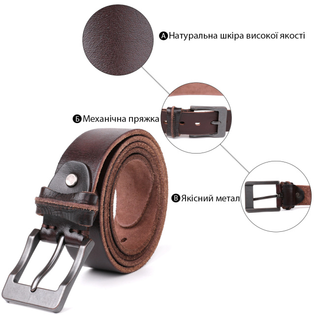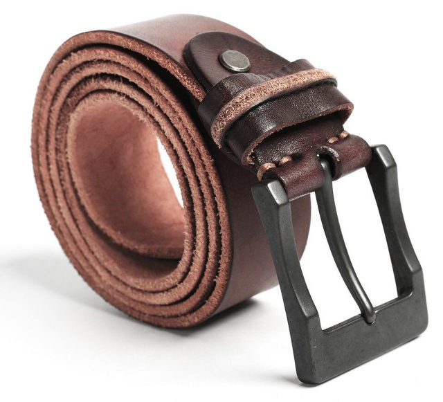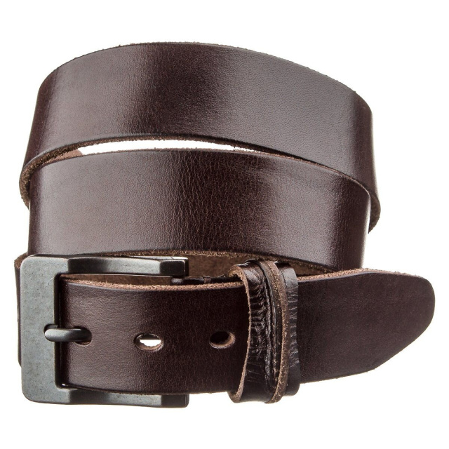 Универсальный классический ремень с массивной пряжкой темно-серого цвета. С внутренней стороны ремень светло-коричневого цвета. Надежный ремень прослужит вам далеко не один год и станет самым оптимальным подарком для мужчины. Если вы не знаете, что выбрать в подарок близкому человеку – советуем вам кожаный ремень. Производство – фабричный Китай. В комплекте к ремню идет картонная упаковка.