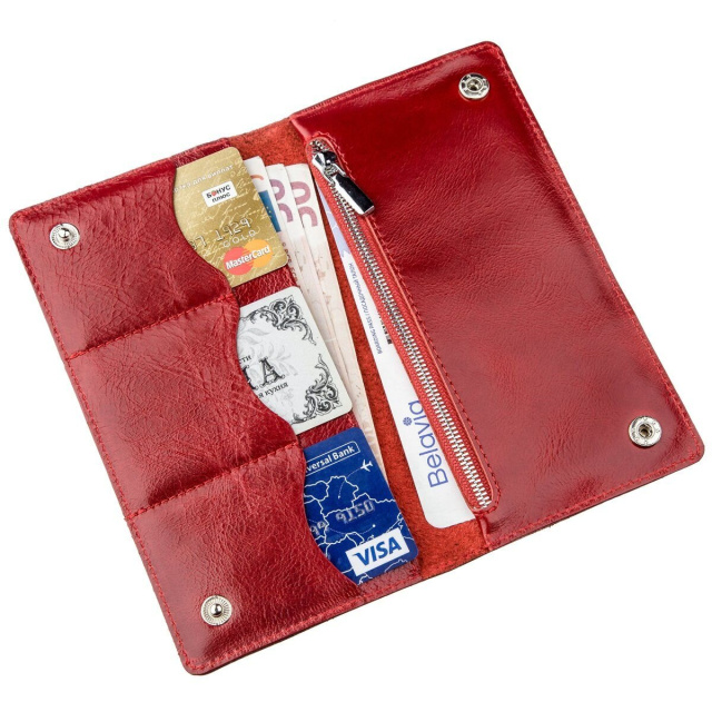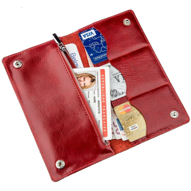 Яркий, стильный, мягкий и блестящий женский бумажник из натуральной кожи. Модель прекрасно переливается на солнце и выглядит просто шикарно. Изделие прекрасно помещается в женскую сумочку и станет вам незаменимым помощником. Прошито изделие по краям красной крепкой нитью в дизайн изделие. На лицевой стороне аксессуара тисненый логотип бренда. Модель закрывается на две кнопки сверху и снизу. Внутри кошелек также выполнен их натуральной кожи. Производство – Украина. В создании кошелька использовались только проверенные материалы и отточенная технология. Мы уверены, что модель понравится ее обладателю.