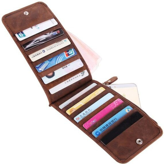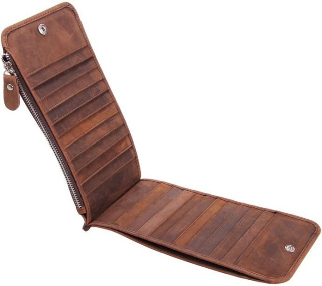 Оригинальная кредитница из натуральной винтажной кожи. Аксессуар чрезвычайно удобный и функциональный. Цвет фурнитуры: латунь. Кошелек не упакован в коробочку, но укомплектован текстильным пылезащитным чехлом. Такой аксессуар станет превосходным решением для подарка родным и близким людям к любому празднику.