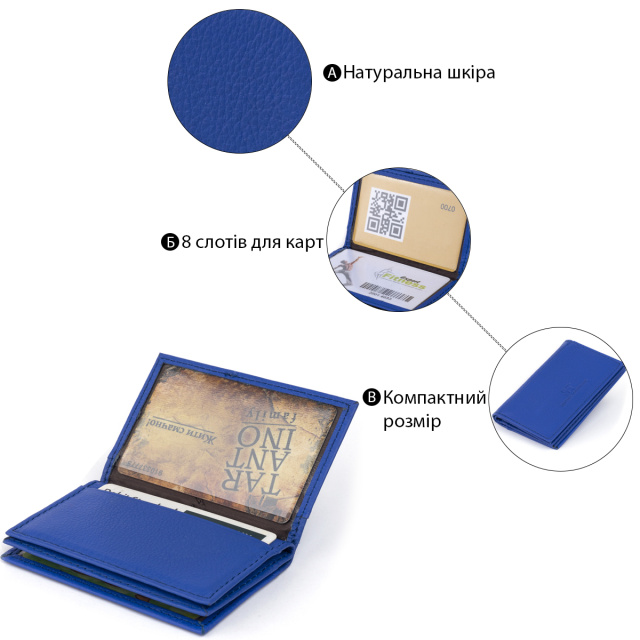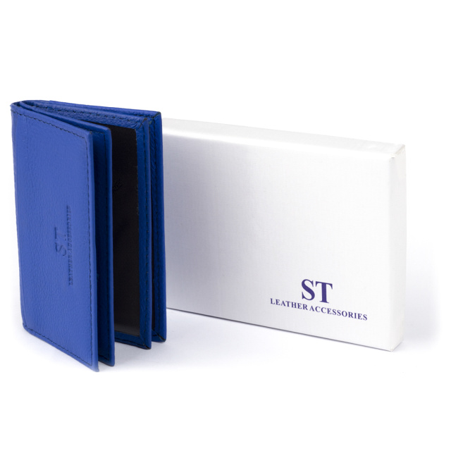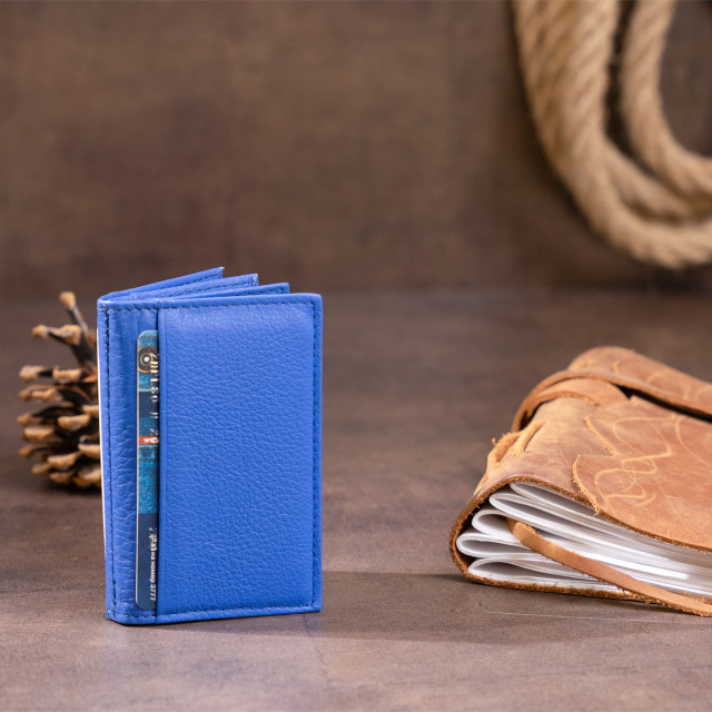 Новинка. Маленькая визитница из натуральной кожи в ярком синем цвете. Аксессуар имеет достаточно слотов для кредиток. Выглядит визитница в виде книжечки. Модель имеет 6 ячеек внутри и 2 ячейки снаружи для кредиток. С таким аксессуаром ваши карточки всегда будут в одном месте. Модель без застежки. В комплекте идет фирменная упаковка. Визитница станет прекрасным подарком для ваших близких.