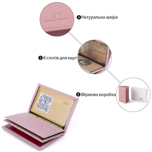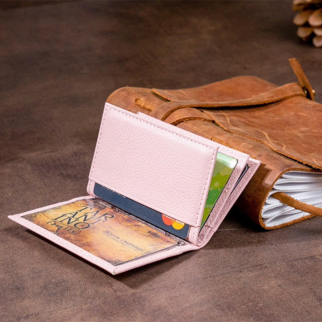Новинка. Маленькая визитница из натуральной кожи в стильном розовом цвете. Аксессуар имеет достаточно слотов для кредиток. Выглядит визитница в виде книжечки. Модель имеет 6 ячеек внутри и 2 ячейки снаружи для кредиток. С таким аксессуаром ваши карточки всегда будут в одном месте. В комплекте идет фирменная упаковка. Визитница станет прекрасным подарком для ваших близких.