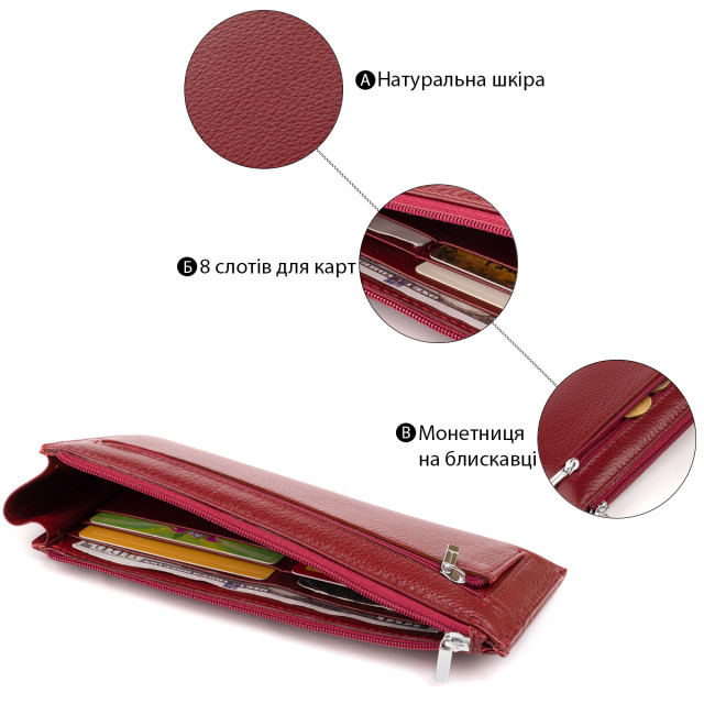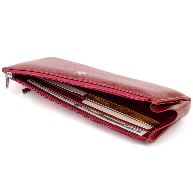 Горизонтальный тонкий кошелек из натуральной кожи мягкой и эластичной. На лицевой стороне аксессуара металлический логотип производителя. В изделие помещаются купюры в развернутом виде. Закрывается аксессуар на молнию. Удобно лежит в руке и не занимает много места в сумочке. Изделие благородного бордового цвета. Подойдет аксессуар для девушки любого возраста. Кошелек укомплектован в фирменную картонную коробку. Такой аксессуар станет лучшим подарком для любой девушки.