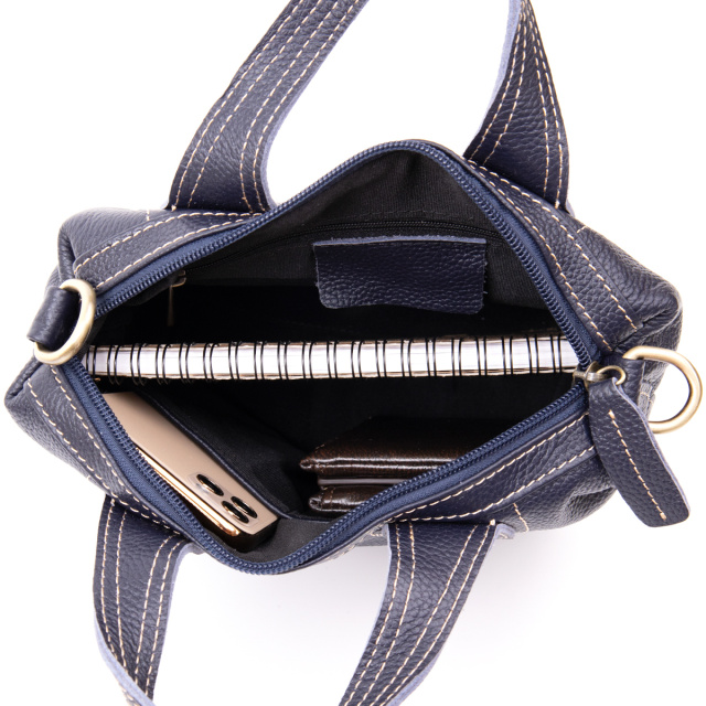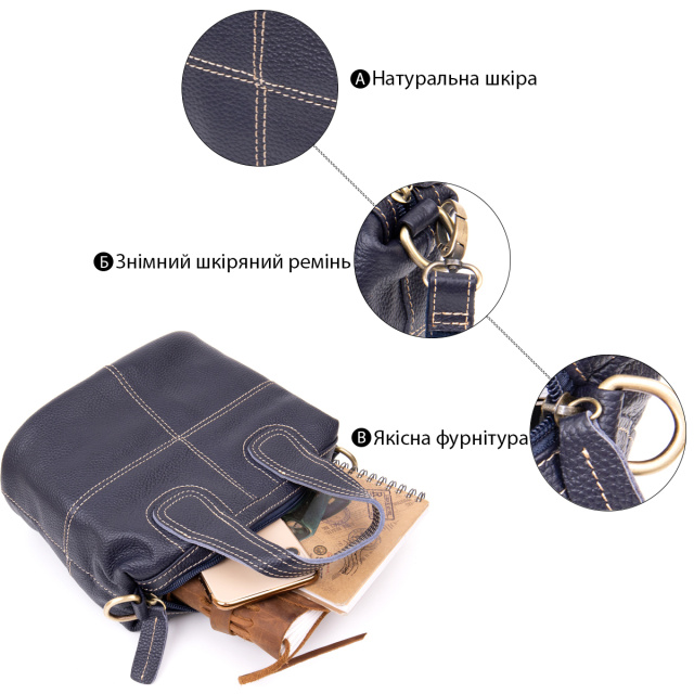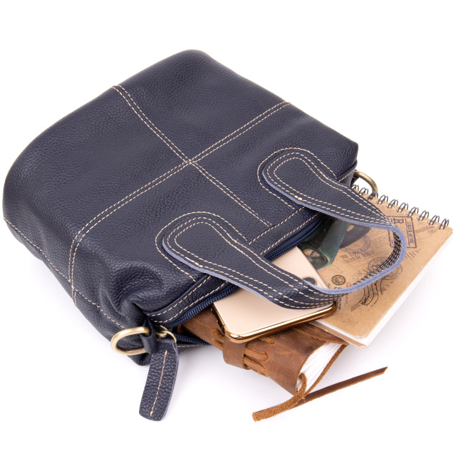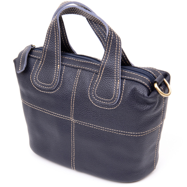Компактная женская сумка из натуральной кожи со светлой нитью в дизайне и в синем цвете. Сумка дополнена качественной фурнитурой. Изделие в коже флотар мягкой, но при этом плотной. Внутри - качественная подкладка. На дне изделия металлические ножки для защиты днища сумки. Сумку удобно носить в руках и на плече. Сумка - идеальный аксессуар на каждый день и для встреч с друзьями или дискотек. Благодаря классическому дизайну данная модель всегда будет на пике популярности. Рекомендуем к покупке данную модель для стильных девушек. Изделие - идеальный вариант для подарка.
