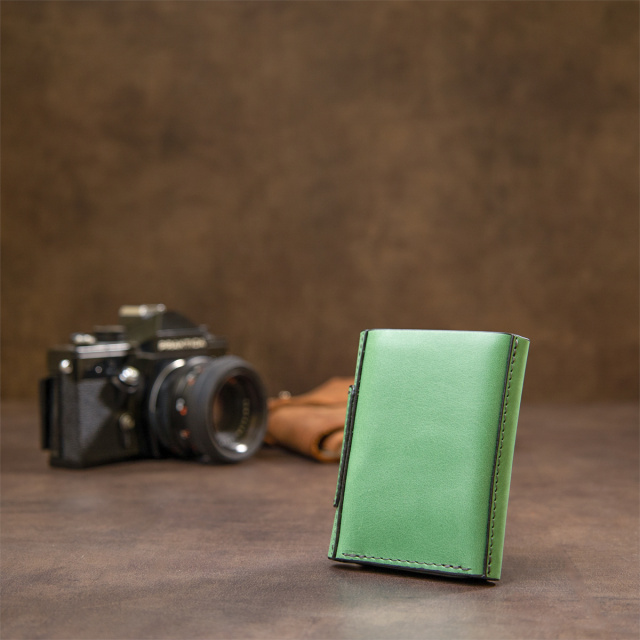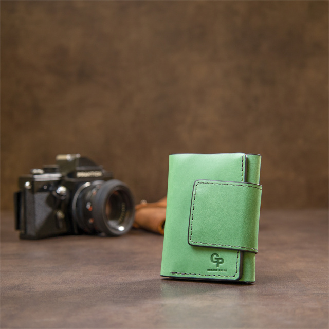 Очень красивое портмоне в необычном зеленом цвете с черной окантовкой краев. Выполнено из натуральной кожи высокого класса исполнения. Закрывается на удобный и практичный скрытый магнит. Внутри есть слоты для карточек и отделение для купюр. Упаковка представлена в виде фирменного чехла.