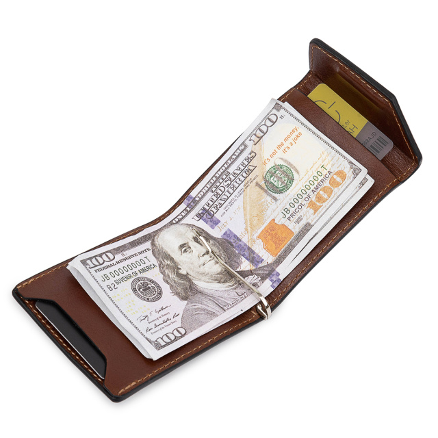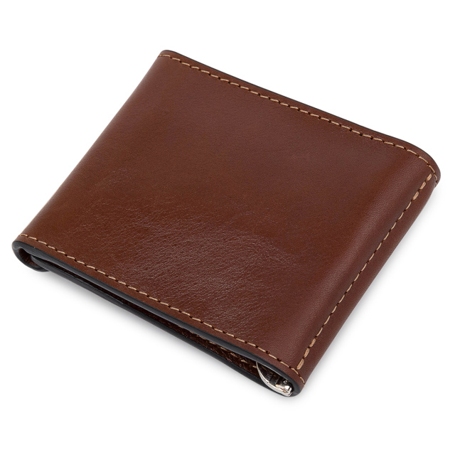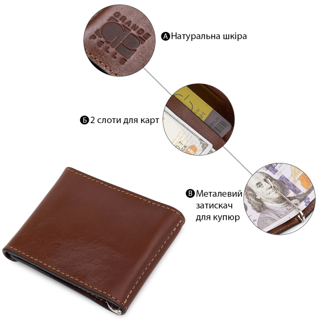 Стильный мужской зажим для денег в насыщенном коричневом цвете от известного украинского производителя. Закрывается на удобный и практичный магнит. Внутри также кроме зажима есть два кармана для карт. Выполнен аксессуар из натуральной высококлассной кожи. Упакован зажим в фирменный плотный чехол.