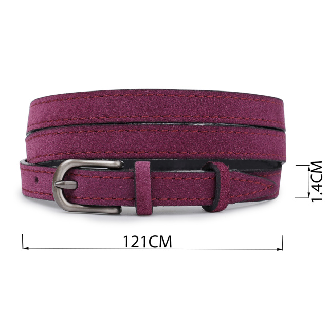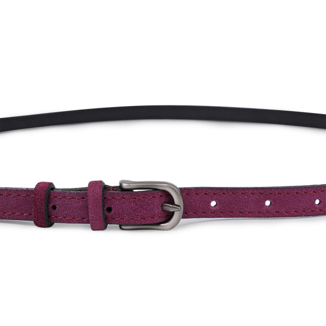 Красивый женский замшевый ремень из натуральной высококлассной кожи с прекрасными эксплуатационными показателями. Имеет очень притягательный фиолетовый цвет, небольшую аккуратную пряжку с классическим механизмом и приятную на ощупь фактуру. Такой ремешок станет ярким акцентов в Вашем образе.