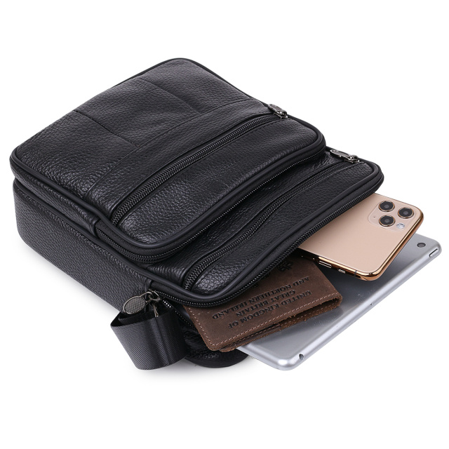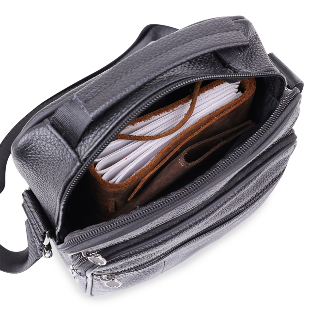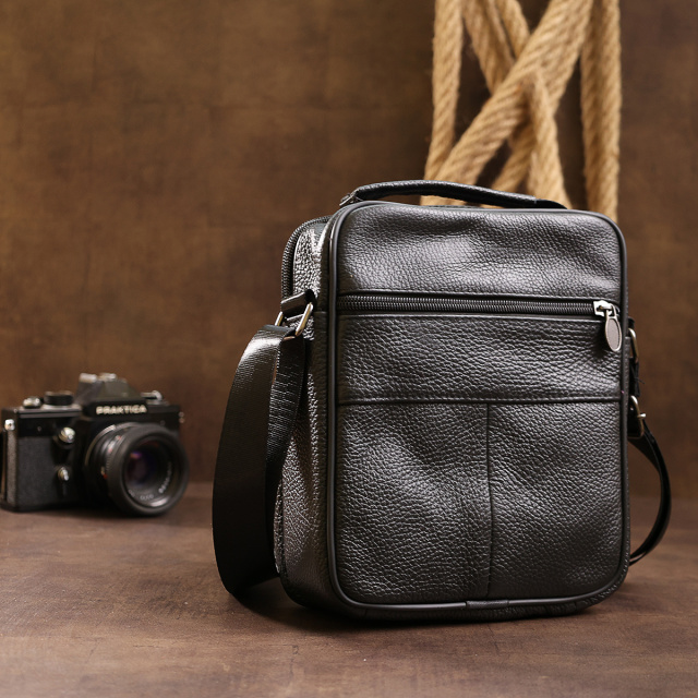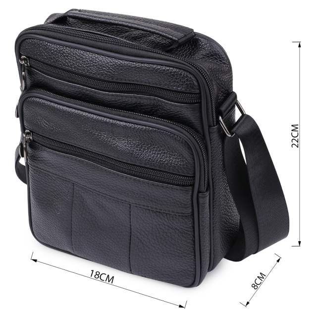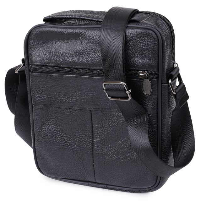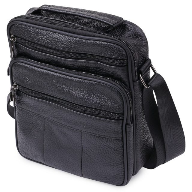 Небольшая, но вместительная мужская сумка из высококлассной кожи, качество которой видно невооруженным глазом. Имеет зернистую матовую фактуру и универсальный черный цвет. Внутри просторное отделение, на внешней стороне также присутствуют просторные карманы на молнии. Сумка очень удобная в использовании, поэтому покупкой Вы точно останетесь довольны.