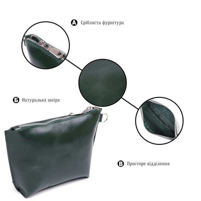 Практичная и удобная косметичка от украинского производителя. Выполнена из натуральной кожи высокого класса с отменными показателями стойкости к износу. Цвет изделия – темно-зеленый с легким переливом, что очень модно в этом сезоне. Фактура – гладкая и приятная на ощупь. Такой аксессуар отлично подойдет на подарок близкому человеку на любой праздник.