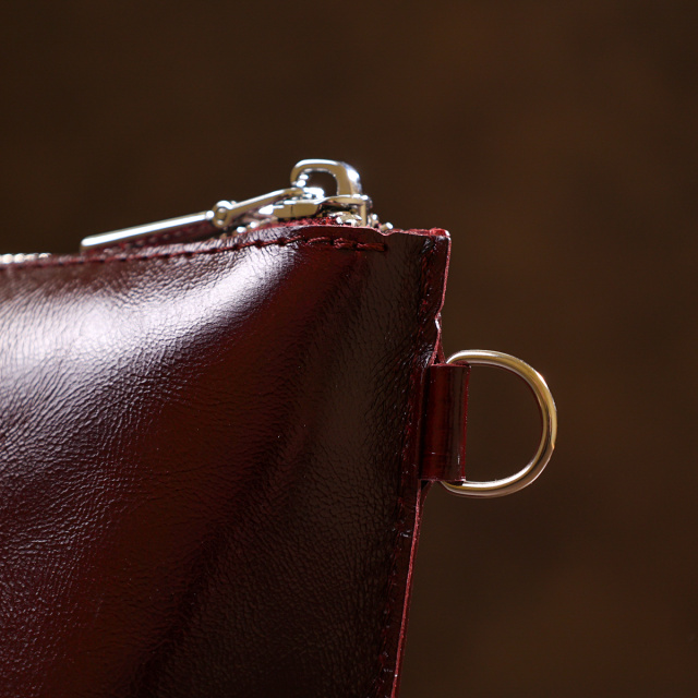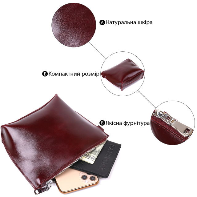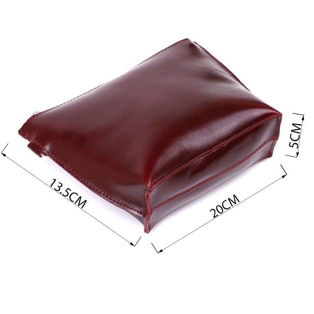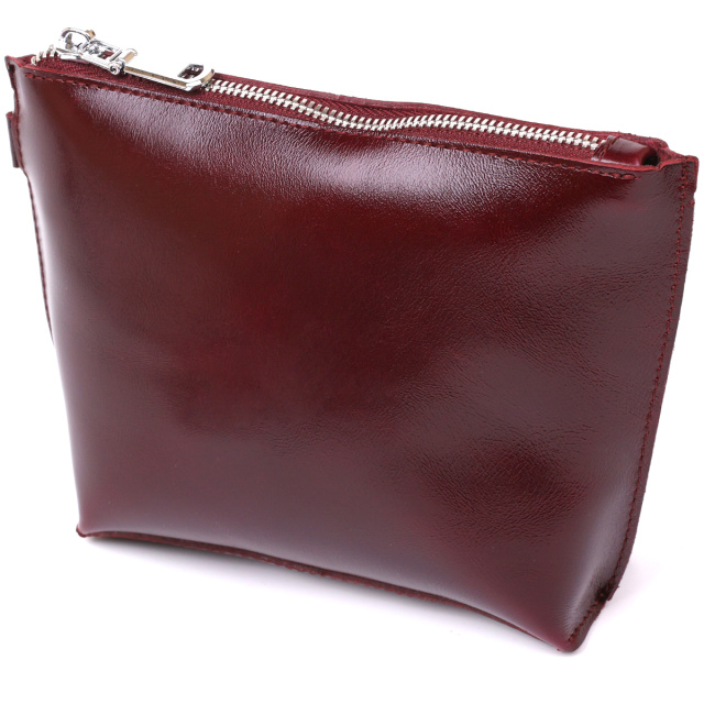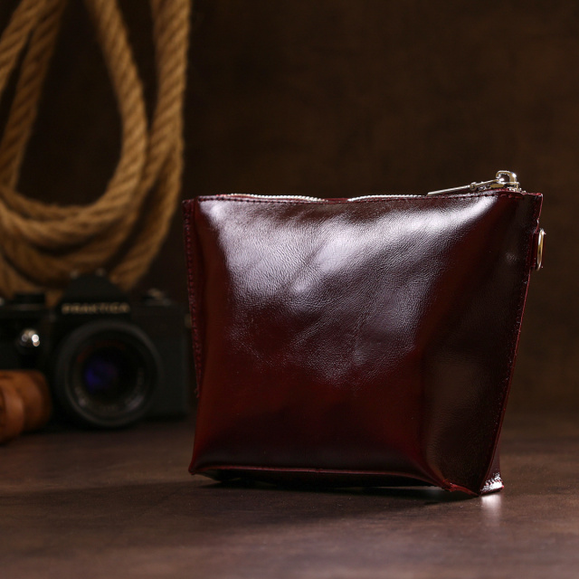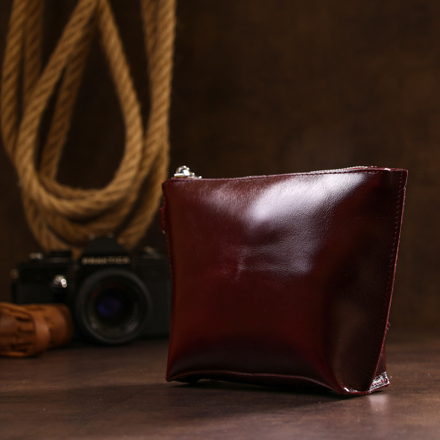 Стильная практичная женская косметичка для хранения ценных мелких вещей, особенно пригодится в дороге. Выполнена в красивом насыщенном бордовом цвете с легким блеском, что смотрится очень модно и богато. Материал – натуральная кожа высокого класса с хорошими показателями износостойкости. Фактура изделия – гладкая. Молния сделана в серебренном цвете.