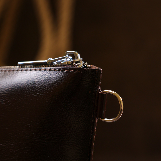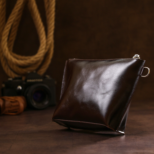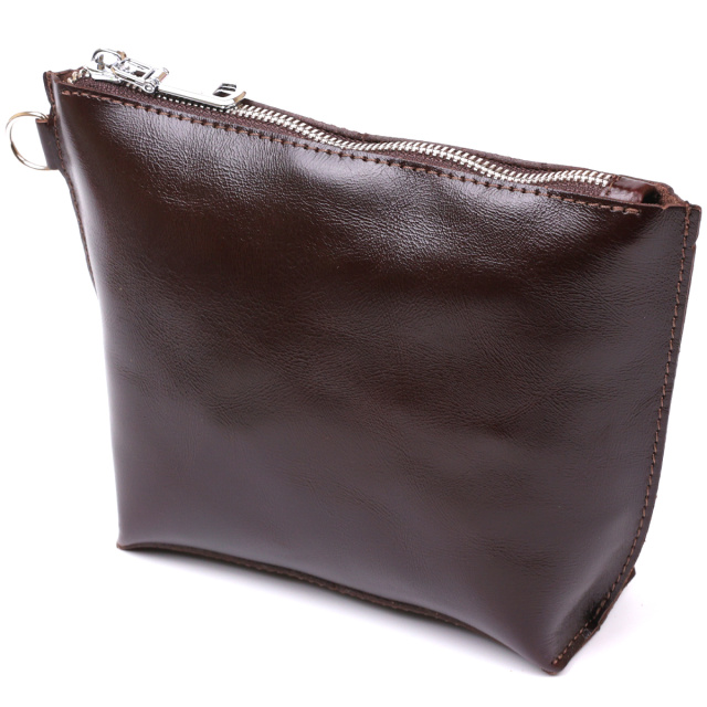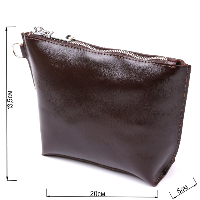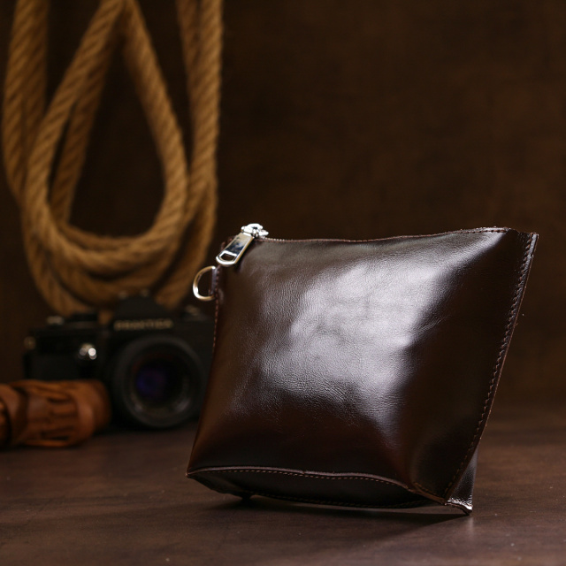 Отличная косметичка для ценных негабаритных вещей, которая легко поместится в сумку или в рюкзак. Цвет изделия – насыщенный коричневый с легким переливом, фактура – гладкая и приятная на ощупь. Материал – натуральная кожа с улучшенными характеристиками прочности и износостойкости. Закрывается косметичка на молнию.