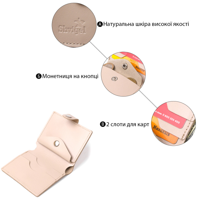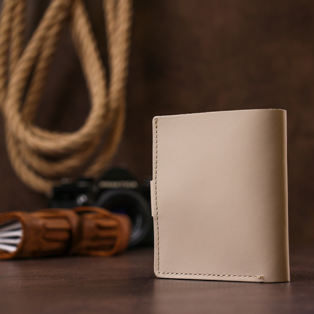 Превосходное портмоне высокого качества от украинского производителя. Имеет красивый бежевый цвет и гладкую приятную на ощупь фактуру. Материал изготовления – натуральная кожа с отменными эксплуатационными характеристиками. Внутри присутствует основное отделение на всю длину, кармашки для пластиковых карточек и небольшая монетница на кнопке.