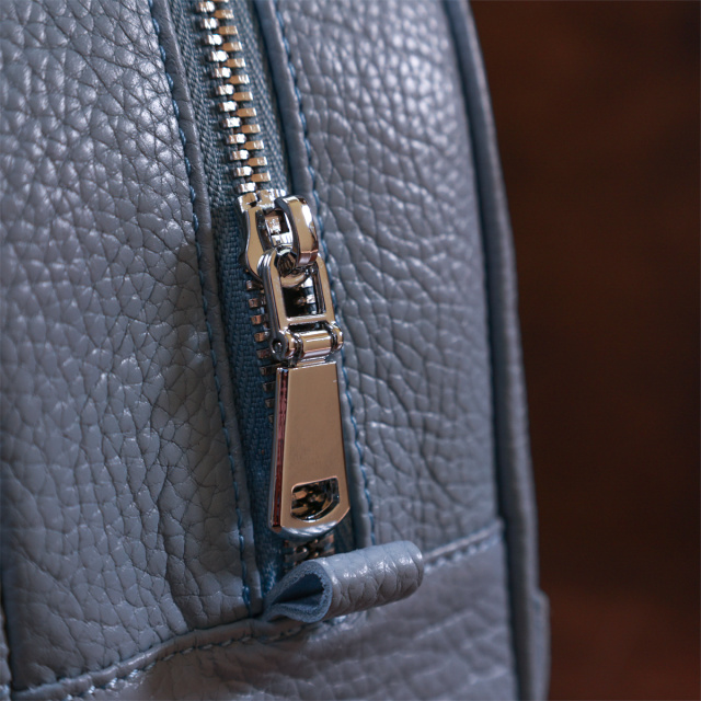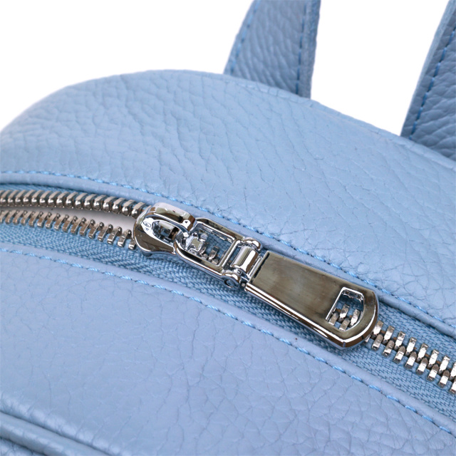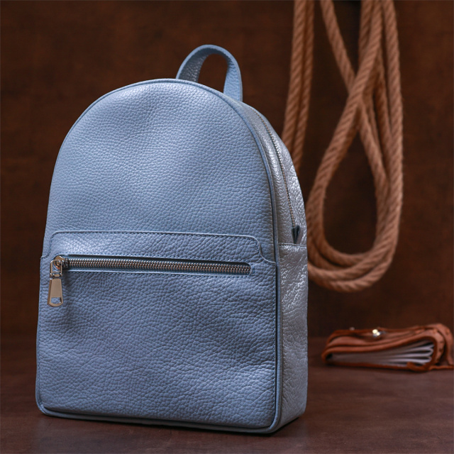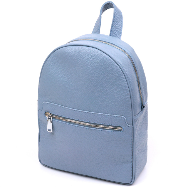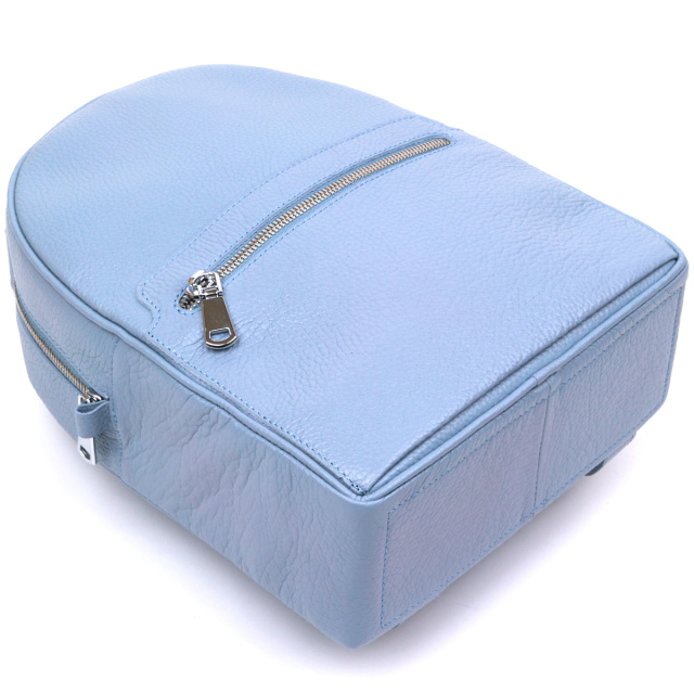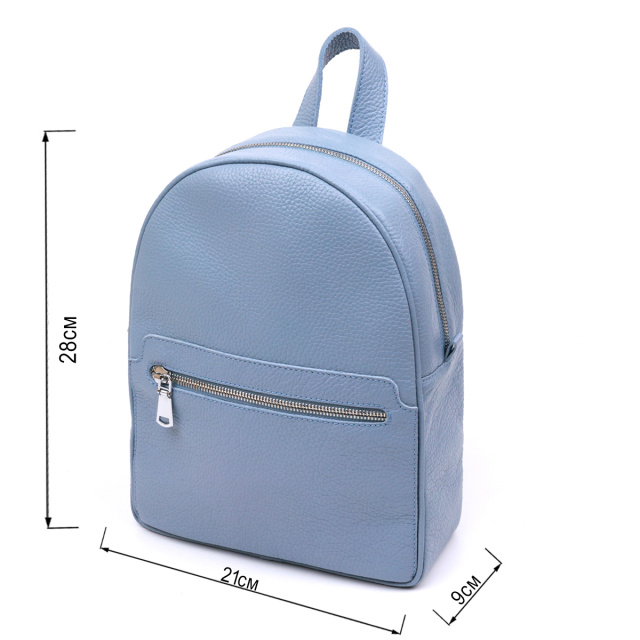 Компактный женский рюкзак от украинского производителя для ценителей простого и аккуратного дизайна без излишеств. Материал изготовления – натуральная кожа высокого качества с отменными характеристиками. Цвет изделия – бледно-голубой, что смотрится красиво и по-летнему свежо, фактура – зернистая. Шлейки регулируются по длине и выполнены также из натуральной кожи.