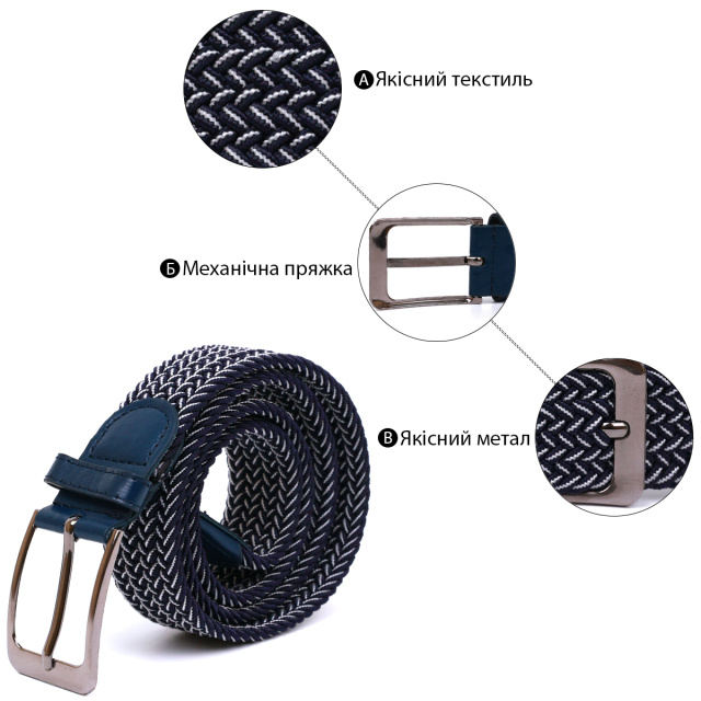 Текстильный ремешок для женщин и мужчин, с классической пряжкой серебристого цвета. Ремень изготовлен в синем цвете, с бело-синим полотном. Особенностью данного ремешка является то, что вам не нужно делать дырки в полотне - они с легкостью делаются при помощи хлястика на пряжке. Узор текстильного полотна раздвигается и хлястик проходит насквозь. Таким образом у вас нет необходимости укорачивать полотно ремня. Текстильный ремешок станет лучшей альтернативой кожаному ремню и при этом значительно сэкономит ваши средства. На нашем сайте вы сможете подобрать подарочную коробку и сделать ваш подарок еще более неожиданным.