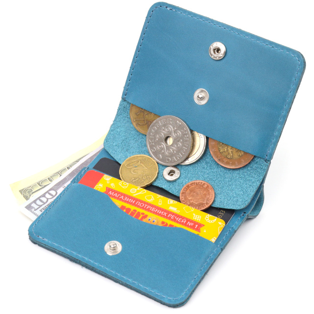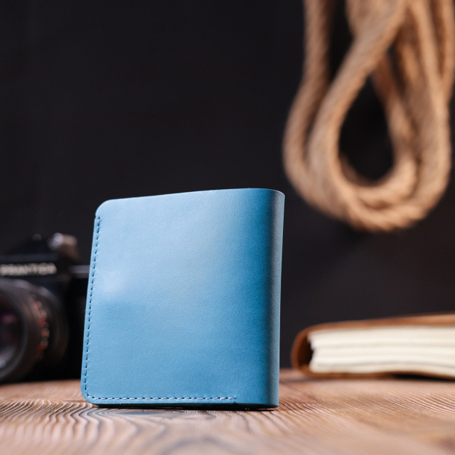 Красивое и практичное по своему дизайну матовое портмоне в необычном голубом цвете. Модель имеет красивый дизайн и достаточный функционал. Вы сможете положить в него все необходимое максимально компактно. Изделие выполнено из натуральной кожи высокого качества и отличной устойчивости к износу. Портмоне имеет вместительное отделение для купюр, слоты для пластиковых карточек и монетницу. Закрывается аксессуар на кнопку. Если вы подыскиваете подарок для близкого человека, то данная модель отлично для этого подойдет.