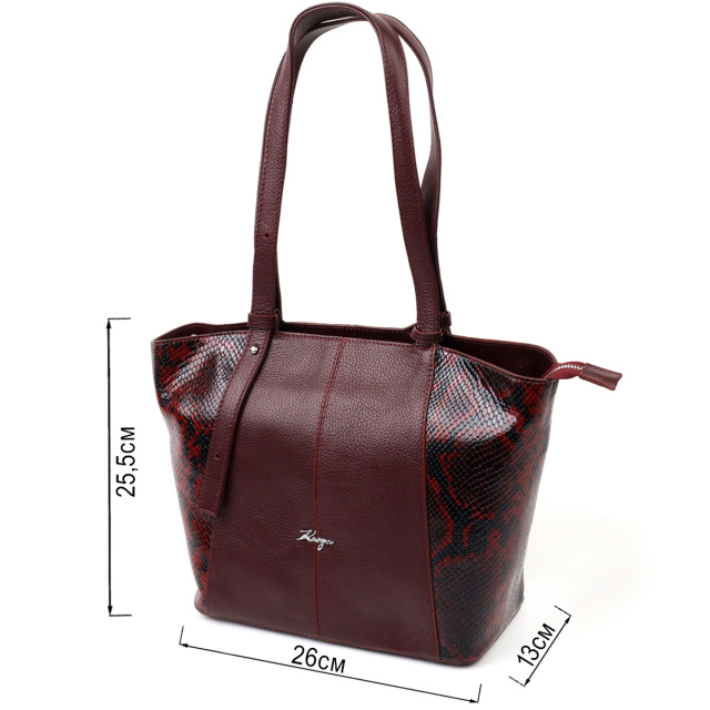 Интересная женская сумка из натуральной фактурной кожи с тиснением под змею и вставкой с мелкозернистой натуральной кожи. Сумка функциональна и удобна в эксплуатации, качественная фурнитура не только дополняет стильный дизайн сумки, но и защищает изделие. Аксессуар упакован в фирменный текстильный мешок Karya. Сумка из натуральной кожи всегда будет отличным подарком любой женщине.