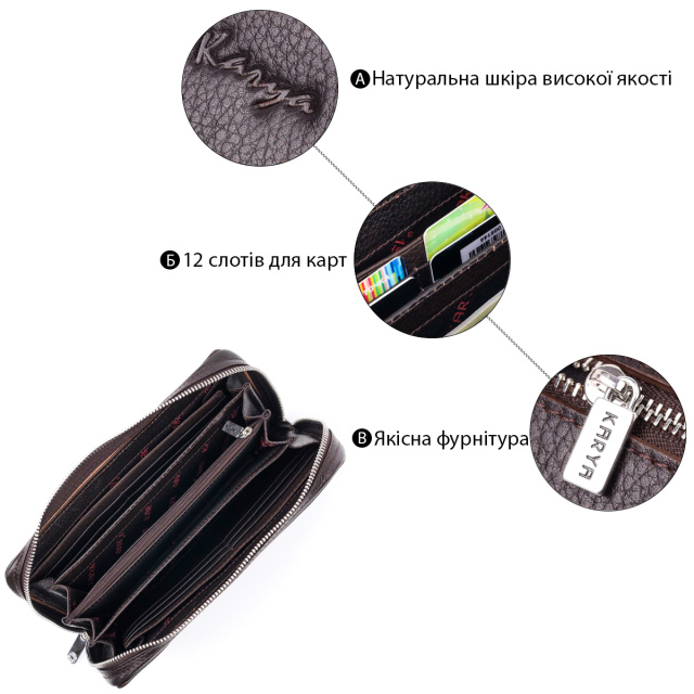 - внутри: карман-перегородка на молнии, шесть открытых карманов, 12 слотов для кредитных карт;