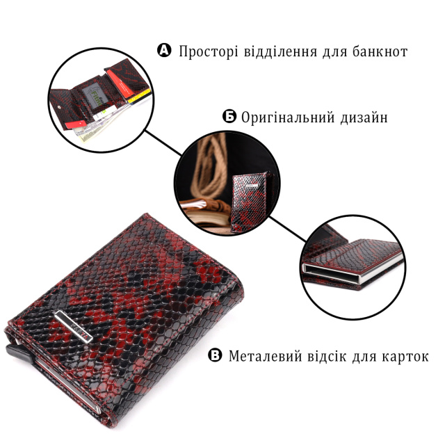 Стильный картхолдер из лакированной кожи, с тиснением под змею, предназначен для хранения банковских и дисконтных карт и небольшого количества наличных. Имеет лаконичный дизайн, отлично ложится в руку, помещается в карман, а также в любую сумку. Кожа мягкая, приятная на ощупь. Механизм работает надежно и удобен в использовании; карточки хорошо закреплены в аксессуаре. Отличная идея для подарка близкому человеку.