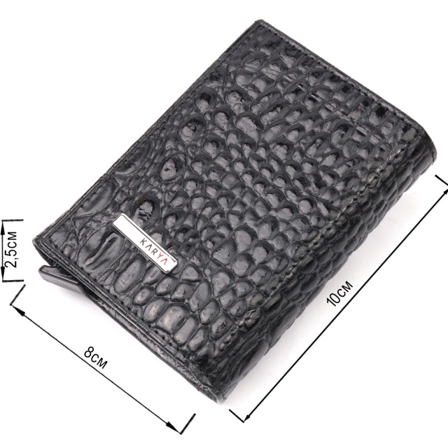 Практичный картхолдер черного цвета из натуральной кожи, с тиснением под крокодила, предназначен для хранения банковских и дисконтных карт и небольшого количества наличных. Имеет лаконичный дизайн, отлично ложится в руку, помещается в карман, а также в любую сумку. Кожа мягкая, приятная на ощупь. Механизм работает надежно и удобен в использовании; карточки хорошо закреплены в аксессуаре. Отличная идея для подарка близкому человеку.