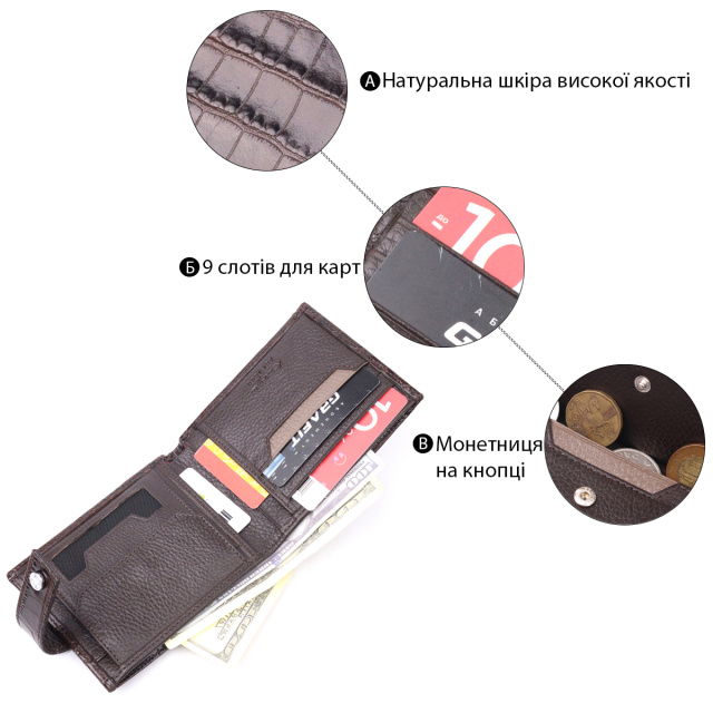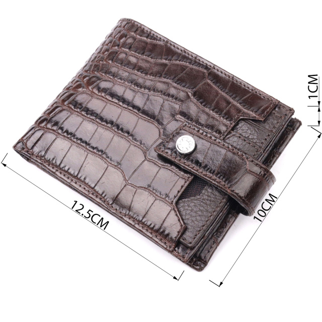 Красивый мужской кошелек из натуральной кожи, в классическом коричневом цвете. Портмоне пошито из комбинации двух видов кожи: фактурной кожи под крокодила - снаружи и зернистой кожи - внутри. С наружной стороны находится карман с блоком под карточки и документы. Закрывается кошелек хлястиком с кнопкой. Обладает стандартным горизонтальным форматом, помещается в карман. Изделия из натуральной кожи всегда будут отличным подарком для близкого человека.