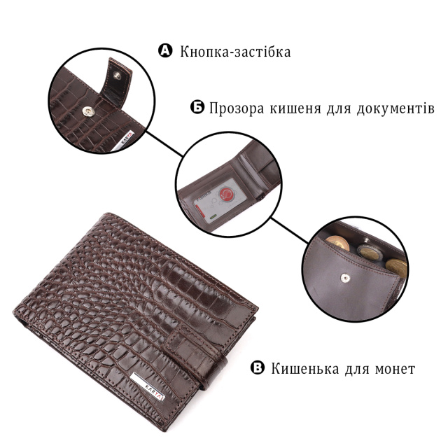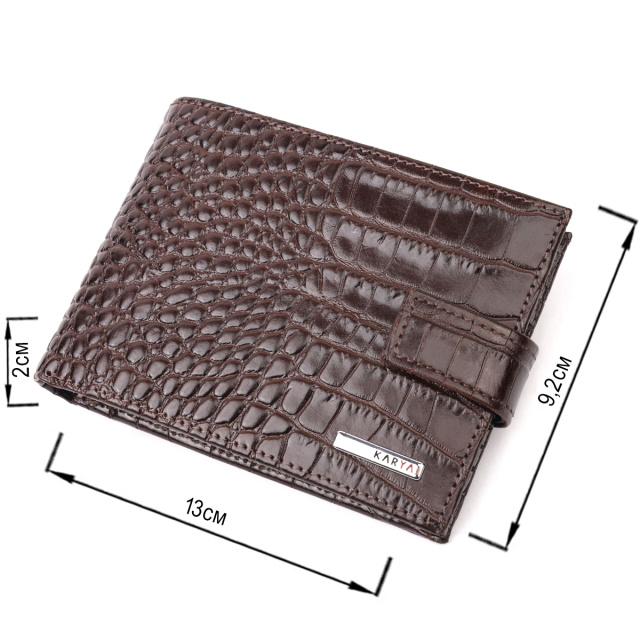 Небольшой мужской кошелек из натуральной кожи с тиснением под рептилию, в коричневом цвете. Изделие закрывается на хлястик с кнопкой . На лицевой стороне в виде декора расположен металлический логотип производителя. Аксессуар упакован в фирменную коробочку. Изделия из натуральной кожи всегда будут отличным подарком для близкого человека.