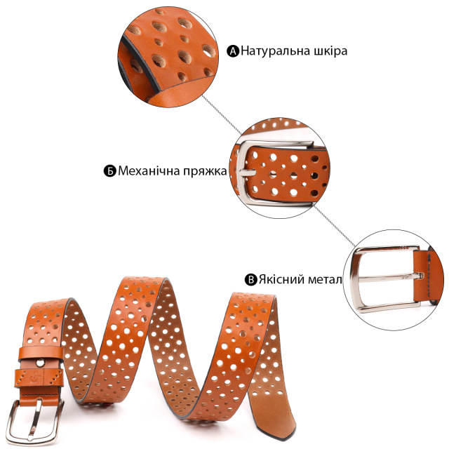 Превосходный ремень из натуральной кожи с перфорацией от украинского производителя. Аксессуар имеет необычную фактуру, аккуратно пошит, длина регулируется в меньшую сторону. Ремень подойдет как женщинам, так и мужчинам. Пряжка классическая в минималистическом дизайне. Качественный кожаный ремень станет хорошим подарком на любой праздник.