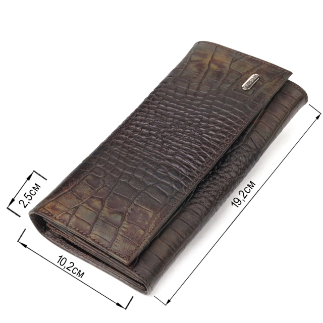 Интересный горизонтальный женский кошелек, из натуральной фактурный кожи, с тиснением под крокодила. Аксессуар имеет три больших кармана для купюр, три прилегающих кармана, восемь ячеек для карточек, три из них под сеточкой, монетницу на молнии. Изделие закрывается клапаном на кнопку. Отличная идея для подарка, которая не оставит равнодушной ни одну женщину.