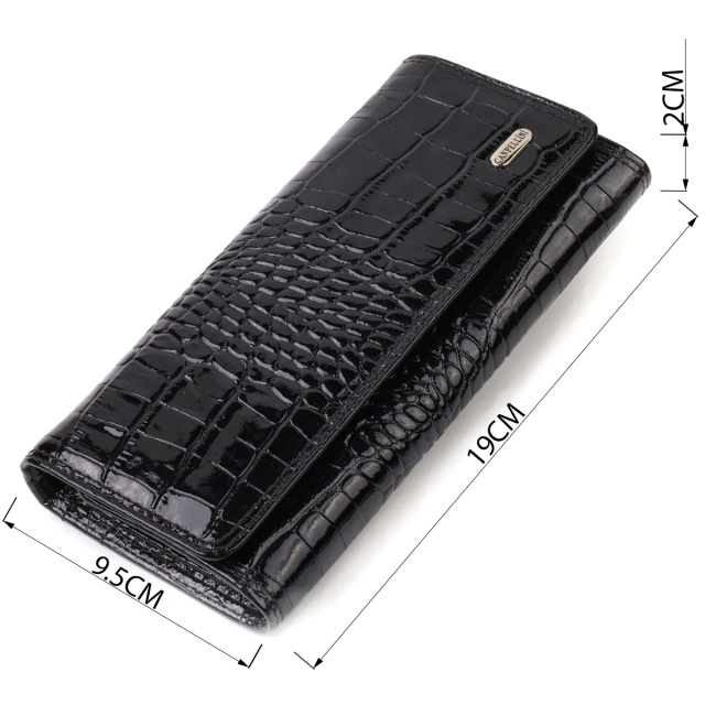 Лакированное женское портомоне горизонтального типа из качественной натуральной кожи, с тиснением под крокодила. Аксессуар имеет три широких отделений для купюр, два кармана на молнии, карман для докумени=тов под сеточкой, один прилегающий кармана и монетницу. Закрывается аксессуар пополам клапаном на кнопку. Приобретая кожаный аксессуар этой фирмы, себе или на подарок, будьте уверены, что он прослужит Вам не один год.