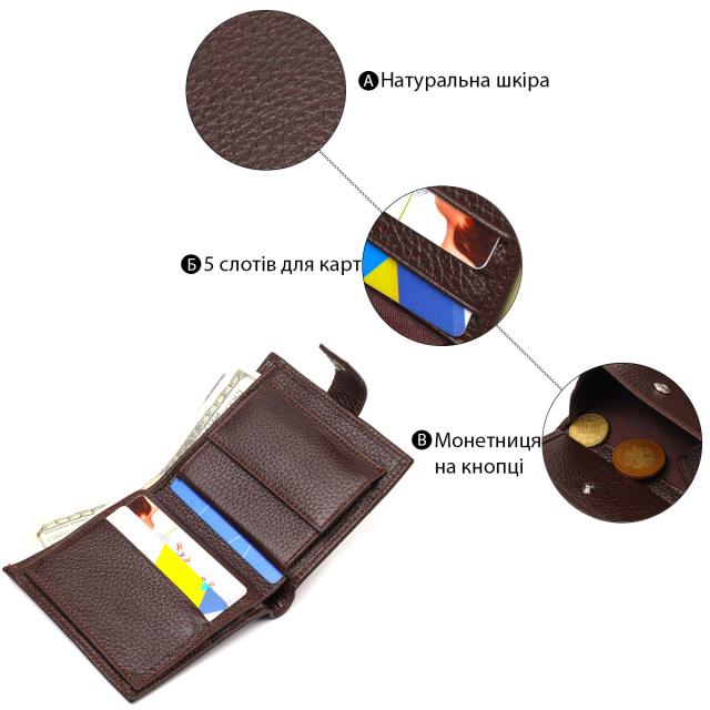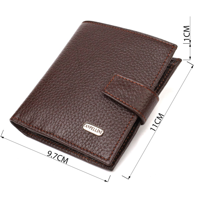 Практичный компактный мужской кошелек из натуральной зернистой кожи. Аксессуар имеет основное отделения с перегородкой, пять отсеков для карточек, два прилегающих кармана, прозрачный карман для документов и монетницу. Закрывается аксессуар хлястиком на кнопку. Отличный аксессуар от надежного производителя, который прослужит очень долго.