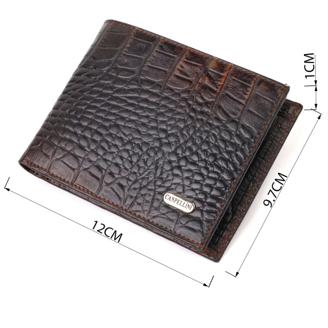 Вместительный и мужской кошелек в необычном коричневом цвете, из натуральной фактурной кожи, с тиснением под крокодила. Аксессуар имеет одно основное отделение с перегородкой, в которое помещаются купюры всех номиналов, четыре кармана для карточек, два кармана под сеточкой для документов, монетницу и три прилегающих кармана. Закрывается аксессуар пополам без застежки. Упакован бумажник картонную коробку. Кожаный кошелек является отменным подарком для родных и близких людей.