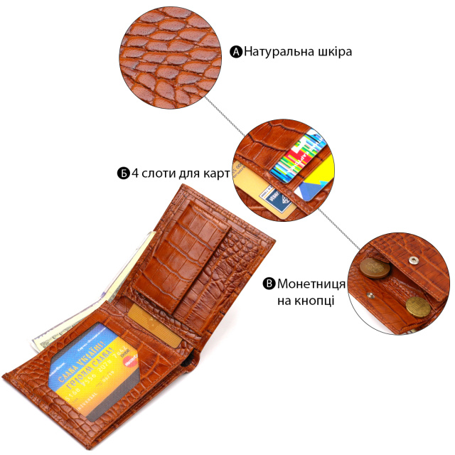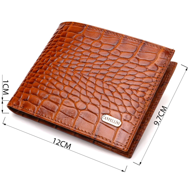 Ультрамодный мужской кошелек в красивом коричневом цвете, из натуральной фактурной кожи с тиснением под крокодила. Аксессуар имеет одно основное отделение с перегородкой, в которое помещаются купюры всех номиналов, четыре кармана для карточек, два кармана под сеточкой для документов, монетницу и три прилегающих кармана. Закрывается аксессуар пополам без застежки. Упакован бумажник картонную коробку. Кожаный кошелек является отменным подарком для родных и близких людей.