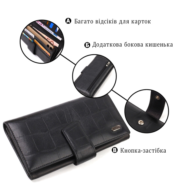 Вместительный мужской кошелек-клатч из натуральной кожи с тиснением под рептилию. Аксессуар имеет одно основное отделение с тканевой перегородкой на молнии, восемнадцать карманов для карточек, карман под сеточкой для пропуска, два скрытых кармана и монетницу. Закрывается аксессуар в два сложения хлястиком на кнопку. На лицевой стороне, в правом нижнем углу металлический логотип компании производителя. Приобретая кожаный аксессуар этой фирмы, себе или на подарок, будьте уверены, что он прослужит Вам не один год.