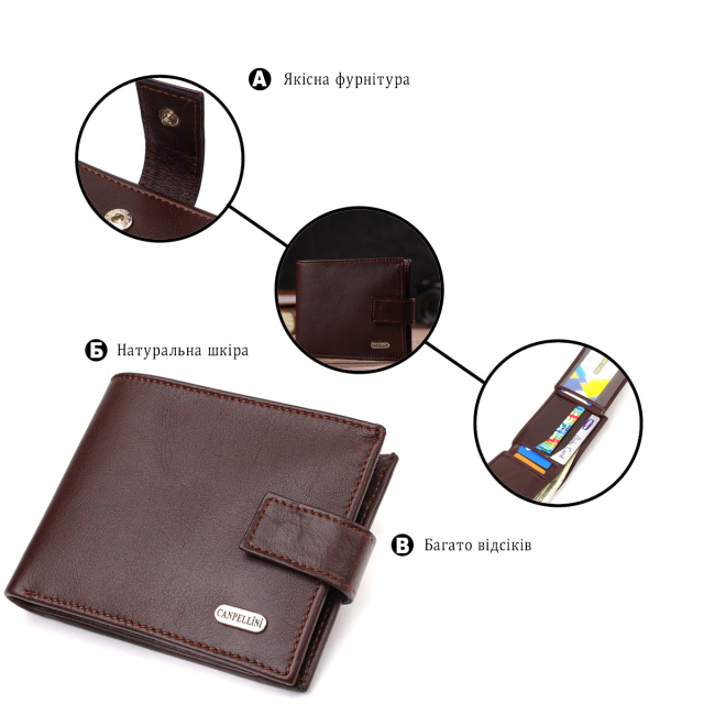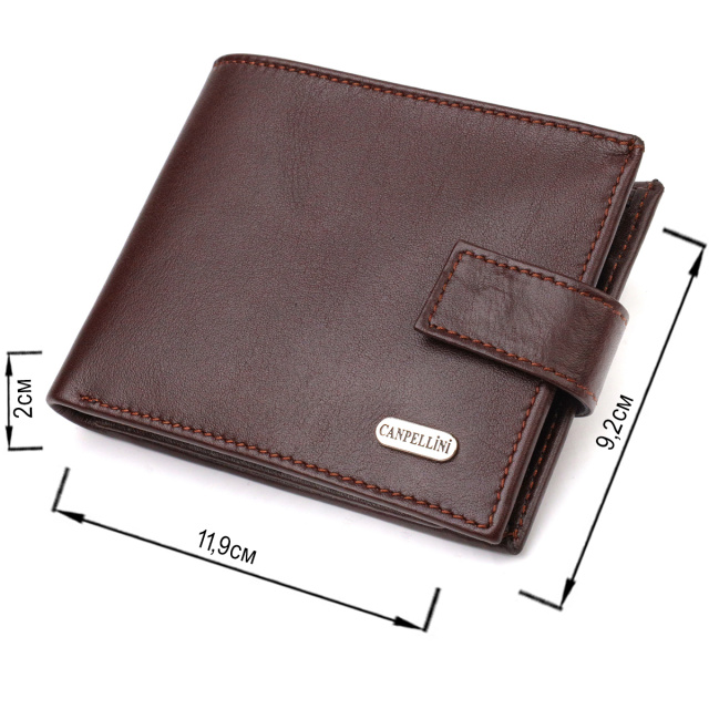 Красивый мужской кошелек компактного размера из натуральной гладкой кожи. Аксессуар имеет основное отделение для купюр с перегородкой, шесть ячеек для карточек, один карман под сеточкой, два прилегающих кармана и монетницу. Кошелек складывается пополам, закрывается хлястиком на кнопку. На лицевой стороне в правом нижнем углу, расположен металлический логотип компании производителя. Покупая кожаный кошелек в нашем магазине, Вы получаете модный, стильный аксессуар, который прослужит не один год.
