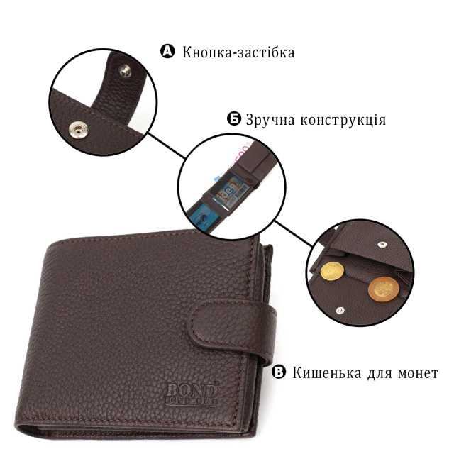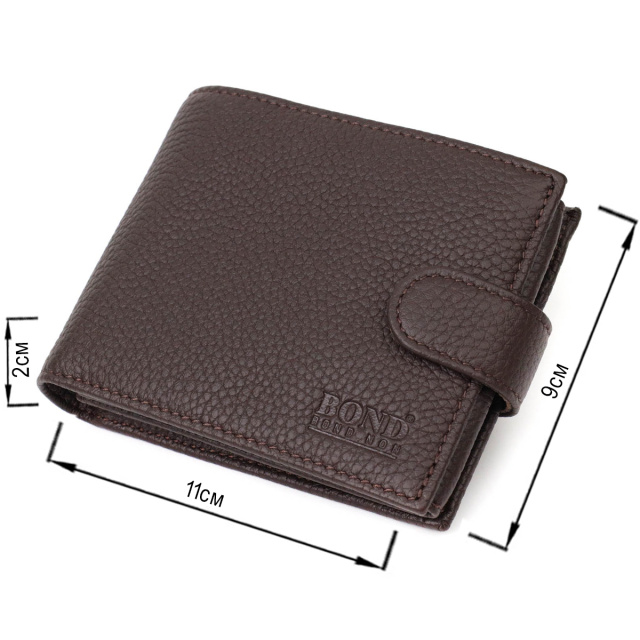 Стильное мужское портмоне, из натуральной мягкой кожи. В данный аксессуар отлично помещаются купюры всех номиналов. Изделие состоит из двух отделений для купюр, шести ячеек для кредиток, одного скрытого кармана, монетницы и трех отделений под сеткой под документы. Закрывается кошелек пополам кожаным хлястиком на кнопку. Изделия из натуральной кожи всегда будут отличным подарком для близкого человека.