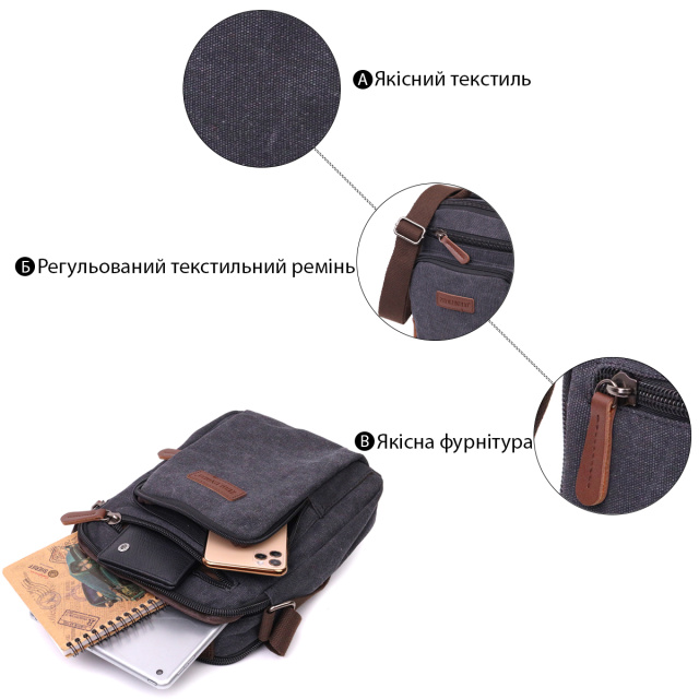Качественная мужская сумка из качественного плотного текстиля. Аксессуар имеет два основных отделения, внутренние два кармана на молнии и открытого типа, и три внешних кармана на молниях разных размеров. Сумку можно носить в руке, на плече и через плечо. В сочетании с качественной фурнитурой и крепкой подкладкой сумка прослужит Вам не один год. Изделие станет прекрасным подарком для любого мужчины.