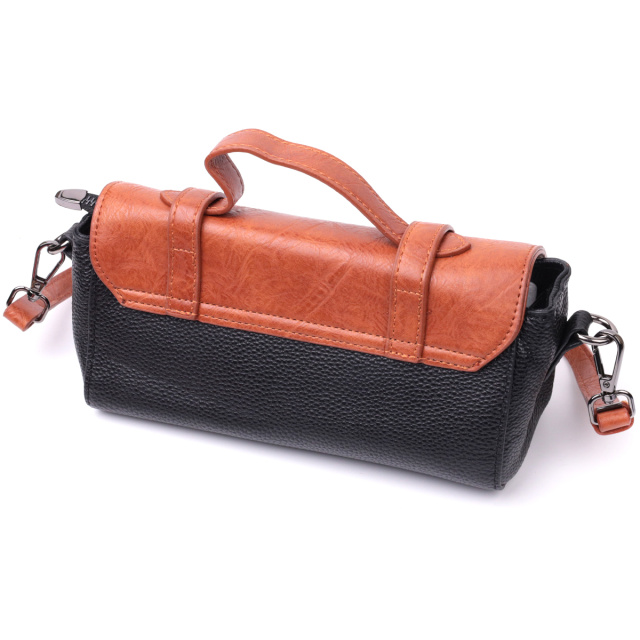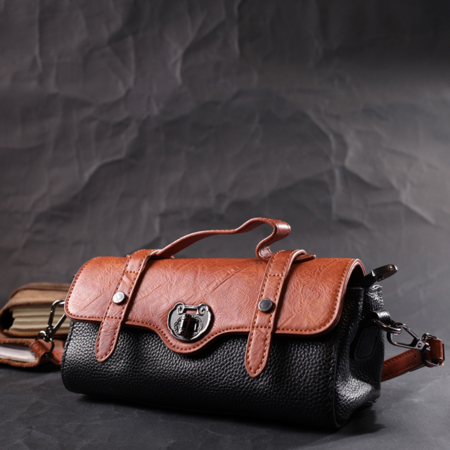 Стильная сумочка в винтажном стиле, которая закрывается на молнию и стильный клапан. Акцентом данной сумочки есть не только форма но и сочетание двух цветов черного и коричневого, такая цветовая гамма придает элегантности и стиля аксессуару. Носить сумку можно в руке, на плече и через плечо, для этого имеются кожаная ручка и кожаный съемный регулируемый ремешок. В изделии использована качественная фурнитура темно-серебряного цвета. Универсальный вариант сумки который подойдет для вечера, а также отлично подойдет на каждый день.